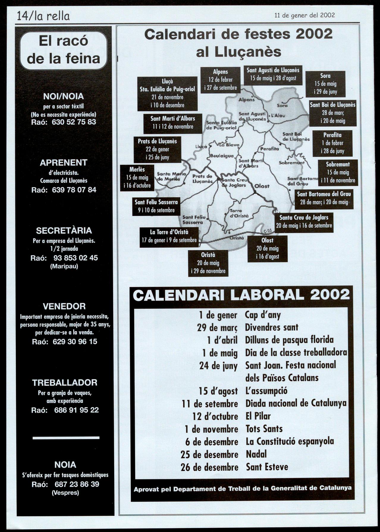 1 de maig Dia de la classe treballadora 24 de iuny Sant Joan. Festa nacional dels Països Catalans 15 d'agost L'assumpció