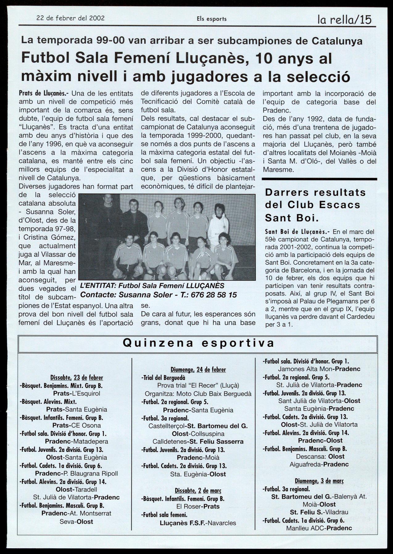 Sant Boi de Lluçonès.- En el marc del 59è campionat de Catalunya, temporada 2001-2002, continua la competíció amb la participació dels equips de Sant Boi. Concretament en la 3a categoria de Barcelona, en la jornada del 10 de febrer, els dos equips que hi participen van tenir resultats contraposats. Així, al grup IV, el Sant Boi s'imposà al Palau de Plegamans per 6 a 2, mentre que en el grup IX, l'equip lluçanès va perdre davant el Cardedeu per 3 a 1.