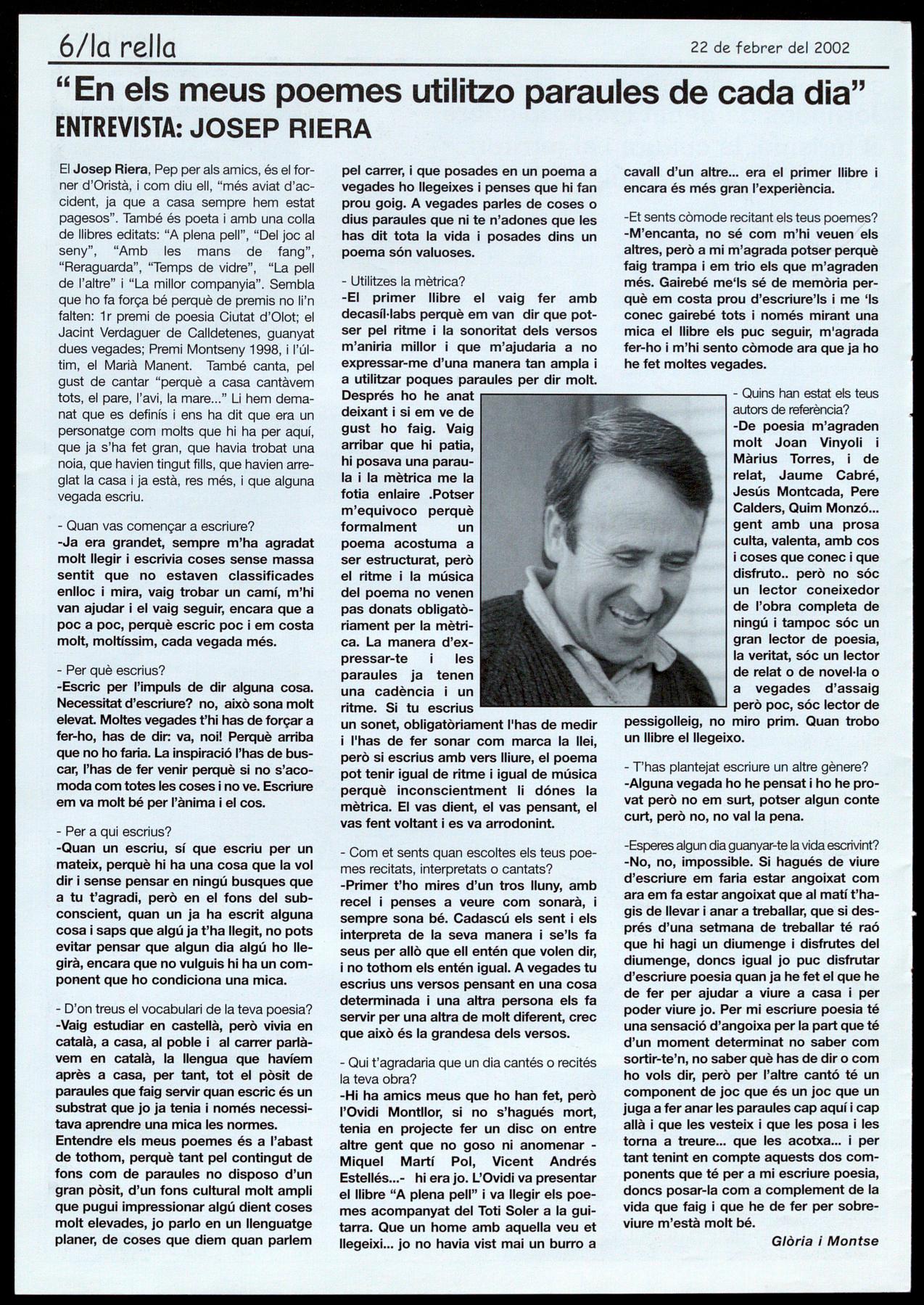 El Josep Riera, Pep per als amics, és el forner d'Oristà, com diu ell, "més aviat d'accident, ja que a casa sempre hem estat pagesos". També és poeta i amb una colla de llibres editats: "A plena peli", "Del joc al seny", "Amb les mans de fang", "Reraguarda", "Temps de vidre", "La pell de l'altre" "La millor companyia". Sembla que ho fa força bé perquè de premis no li'n falten: 1 r premi de poesia Ciutat d'Olot; el Jacint Verdaguer de Calldetenes, guanyat dues vegades; Premi Montseny 1998, l'últim, el Marià Manent. També canta, pel gust de cantar "perquè a casa cantàvem tots, el pare, l'avi, la mare Li hem demanat que es definís i ens ha dit que era un personatge com molts que hi ha per aquí, que ja s'ha fet gran, que havia trobat una noia, que havien tingut fills, que havien arreglat la casa ja està, res més, i que alguna vegada escriu.