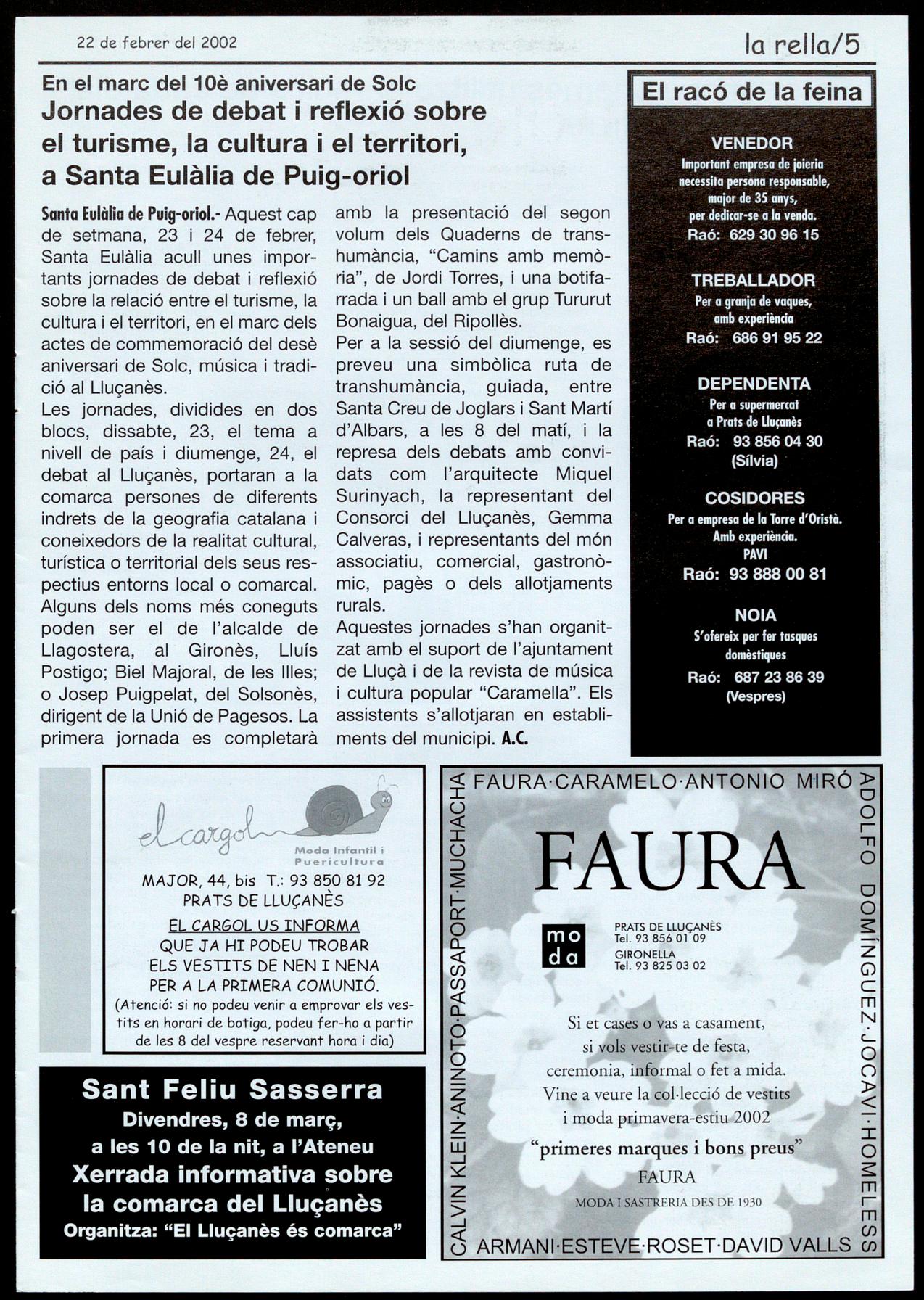 Santa Eulàlia de Puig-oriol.- Aquest cap de setmana, 23 i 24 de febrer, Santa Eulàlia acull unes importants jornades de debat i reflexió sobre la relació entre el turisme, la cultura i el territori, en el marc dels actes de commemoració del desè aniversari de Solc, música i tradició al Lluçanès. Les jornades, dividides en dos blocs, dissabte, 23, el tema a nivell de país i diumenge, 24, el debat al Lluçanès, portaran a la comarca persones de diferents indrets de la geografia catalana i coneixedors de la realitat cultural, turística o territorial dels seus respectius entorns local o comarcal. Alguns dels noms més coneguts poden ser el de l'alcalde de Llagostera, al Gironès, Lluís Postigo; Biel Majoral, de les Illes; o Josep Puigpelat, del Solsonès, dirigent de la Unió de Pagesos. La primera jornada es completarà