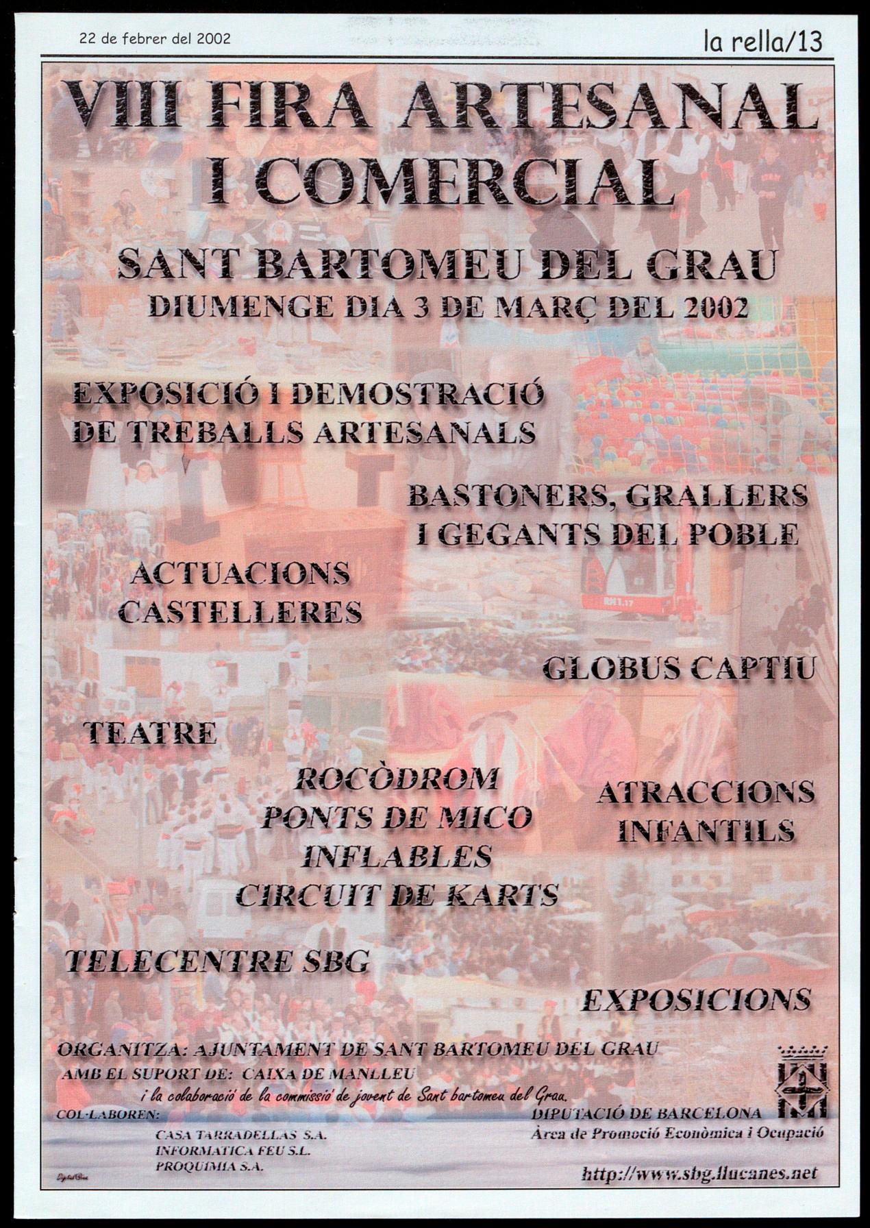 13 OBRES PRESENTADES AL CONCURS DE CARTELLS SOLC-2002. La tercera edició del concurs de cartells Solc2002, que coincideix amb el desè aniversari del cicle, ha tingut un alt nivell de participació, amb la presentació de tretze obres, totes del Lluçanès exceptuant-ne una, del Barcelonès, que ha fet que el premi, atorgat pel jurat format per la Junta de l'associació, hagi anat a parar a Imma Boixadé, de Santa Eulàlia de Puig-oriol, que s'endurà 178,57 euros -equivalent a 30.000'-ptes.- la subscripció, per un any, a la revista Caramella. Els premis es lliuraran en un acte públic que es farà durant el mes de març .A.C.