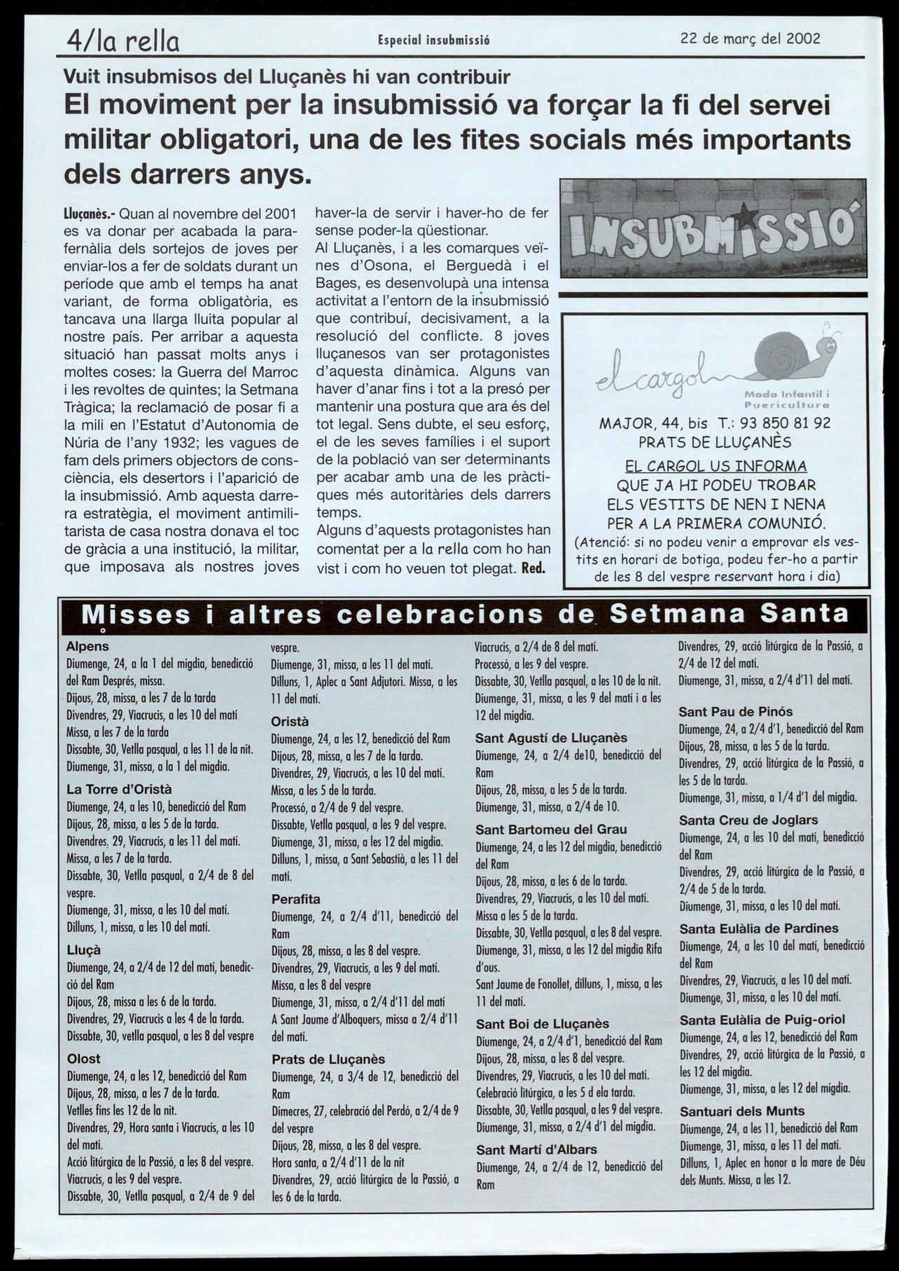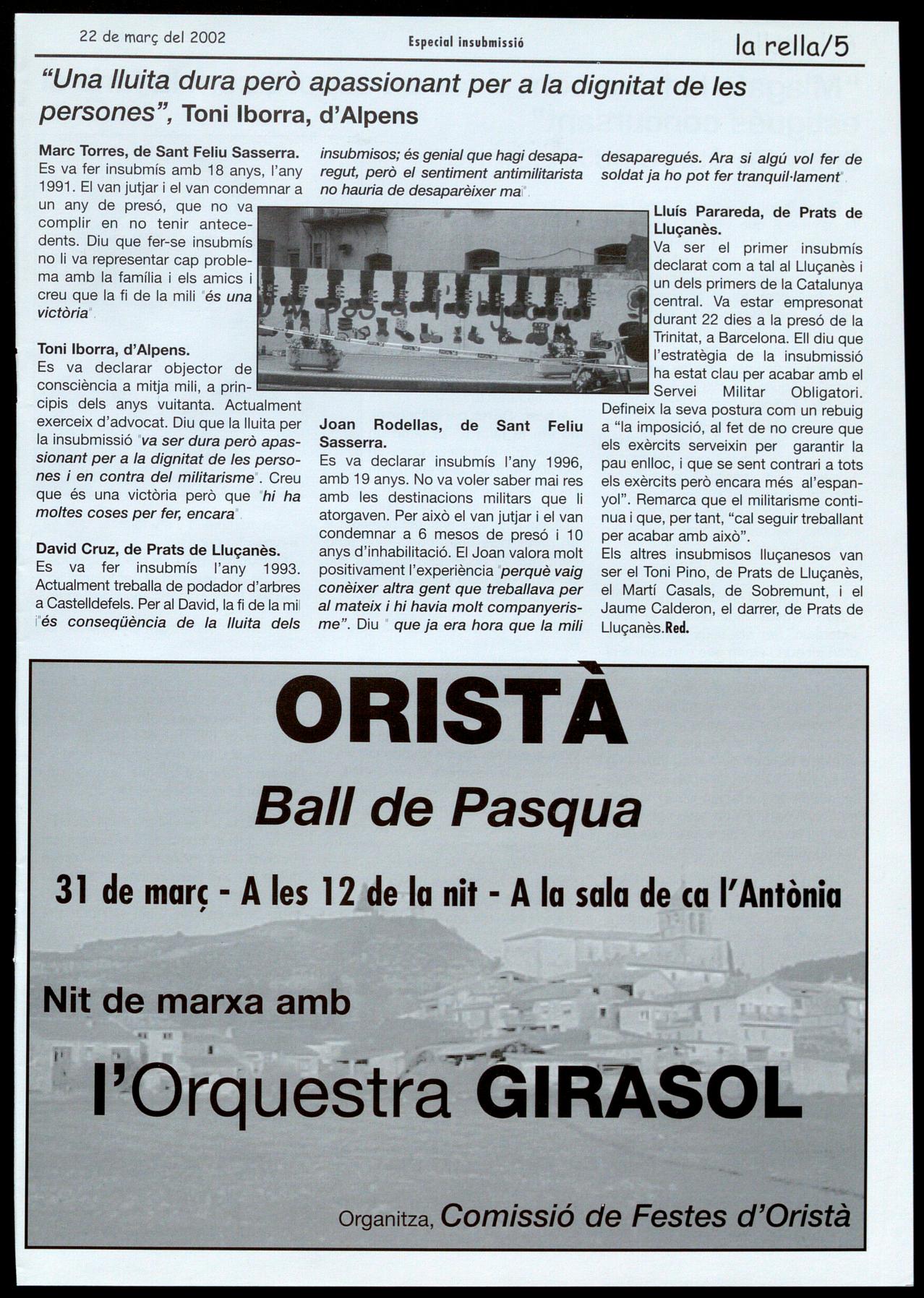 Lluçanès.- Quan al novembre del 2001 haver-Ia de servir haver-ho de fer es va donar per acabada la parafernàlia dels sortejos de joves per enviar-los a fer de soldats durant un període que amb el temps ha anat variant, de forma obligatòria, es tancava una llarga lluita popular al nostre país. Per arribar a aquesta situació han passat molts anys moltes coses: la Guerra del Marroc i les revoltes de quintes; la Setmana Tràgica; la reclamació de posar fi a la mili en l'Estatut d'Autonomia de Núria de l'any 1932; les vagues de fam dels primers objectors de consciència, els desertors l'aparició de la insubmissió. Amb aquesta darrera estratègia, el moviment antirnilltarista de casa nostra donava el toc de gràcia a una institució, la militar, que imposava als nostres joves