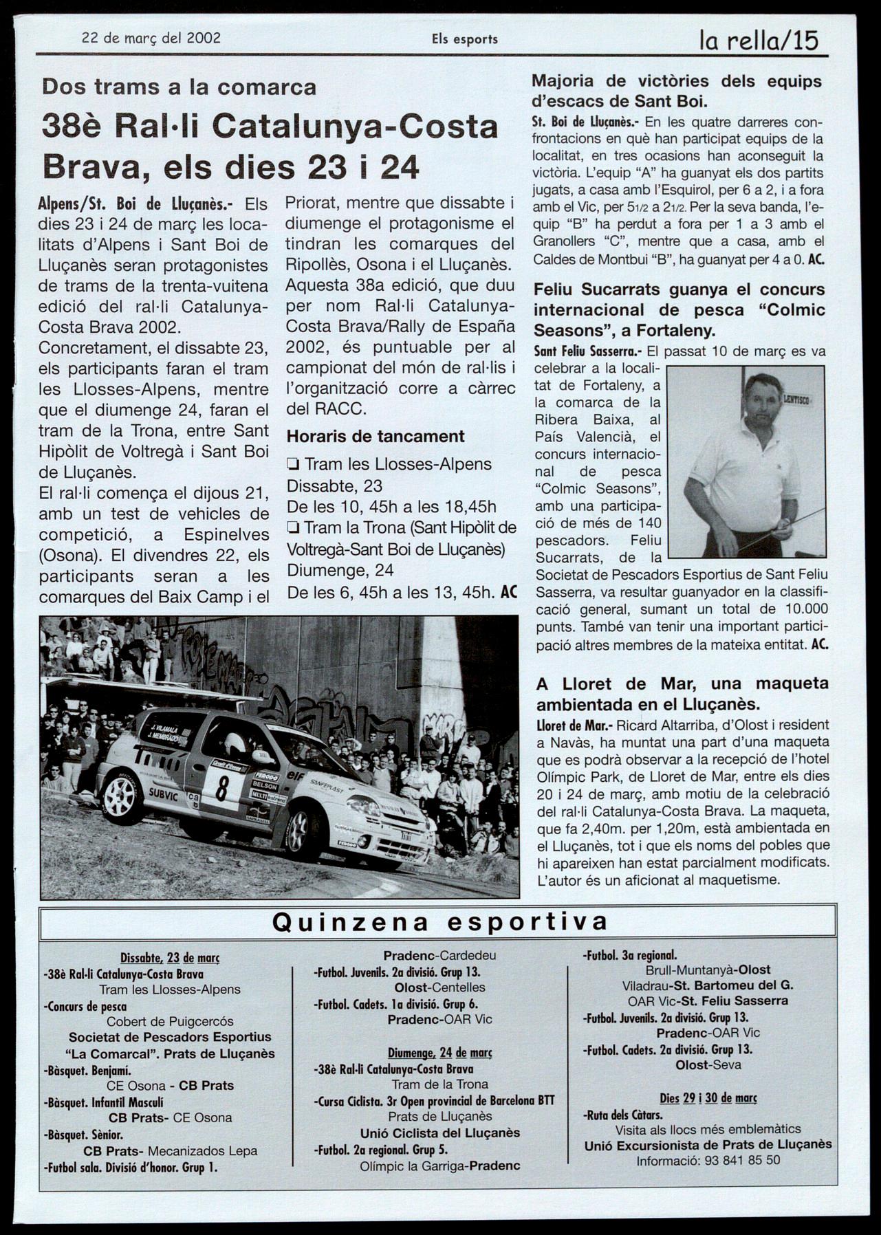 Alpens/St. Boi de Lluçanès.- Els dies 23 i 24 de març les localitats d'Alpens Sant Boi de Lluçanès seran protagonistes de trams de la trenta-vuitena edició del ral·li CatalunyaCosta Brava 2002.