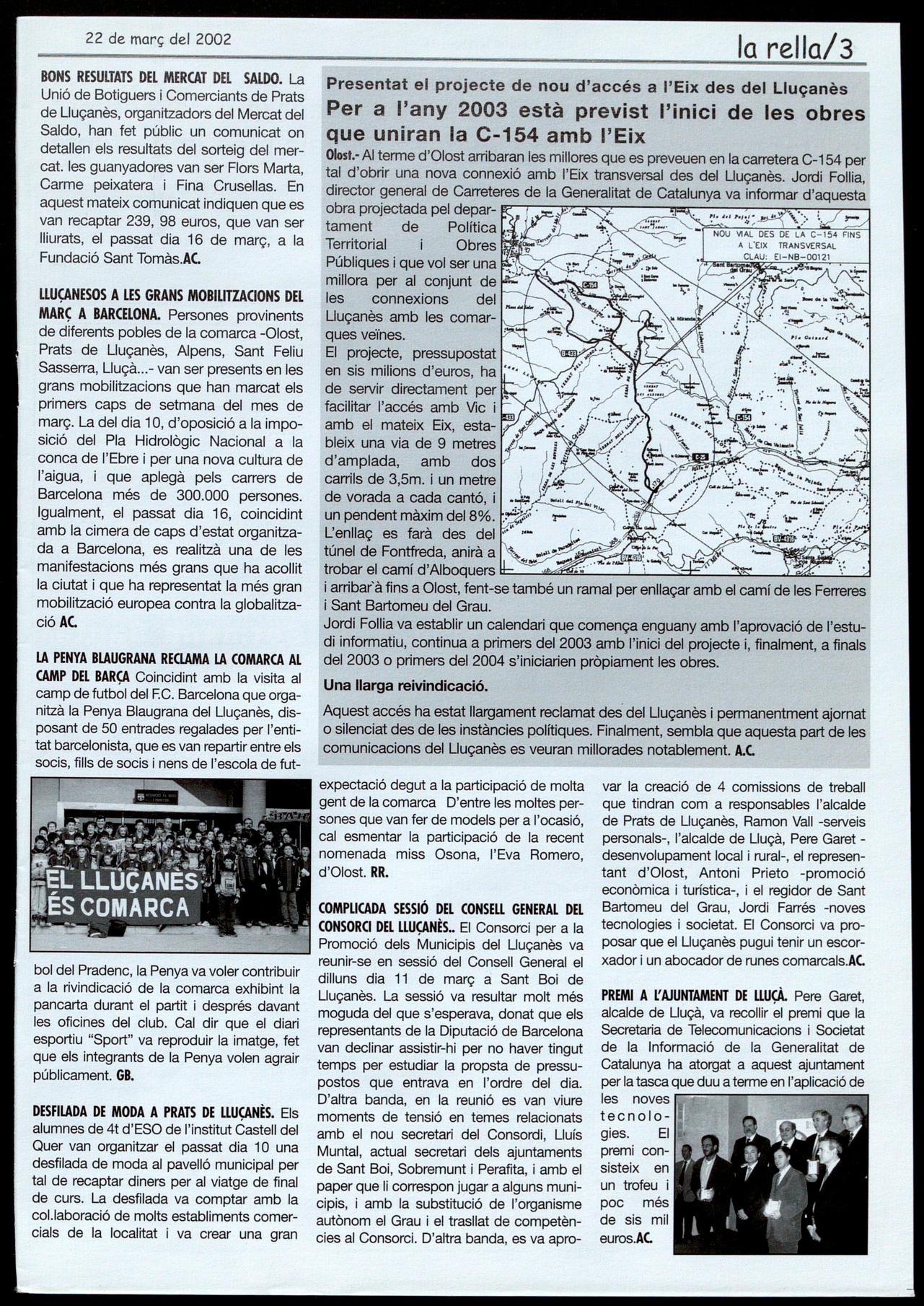 LLUÇANESOS A LES GRANS MOBILITZACIONS DEL MARÇ A BARCELONA. Persones provinents de diferents pobles de la comarca -Olost, Prats de Lluçanès, Alpens, Sant Feliu Sasserra, Lluçà - van ser presents en les grans mobilitzacions que han marcat els primers caps de setmana del mes de març. La del dia 10, d'oposició a la imposició del Pla Hidrològic Nacional a la conca de l'Ebre per una nova cultura de l'aigua, i que aplegà pels carrers de Barcelona més de 300.000 persones. Igualment, el passat dia 16, coincidint amb la cimera de caps d'estat organitzada a Barcelona, es realitzà una de les manifestacions més grans que ha acollit la ciutat i que ha representat la més gran mobilització europea contra la globalització AC.