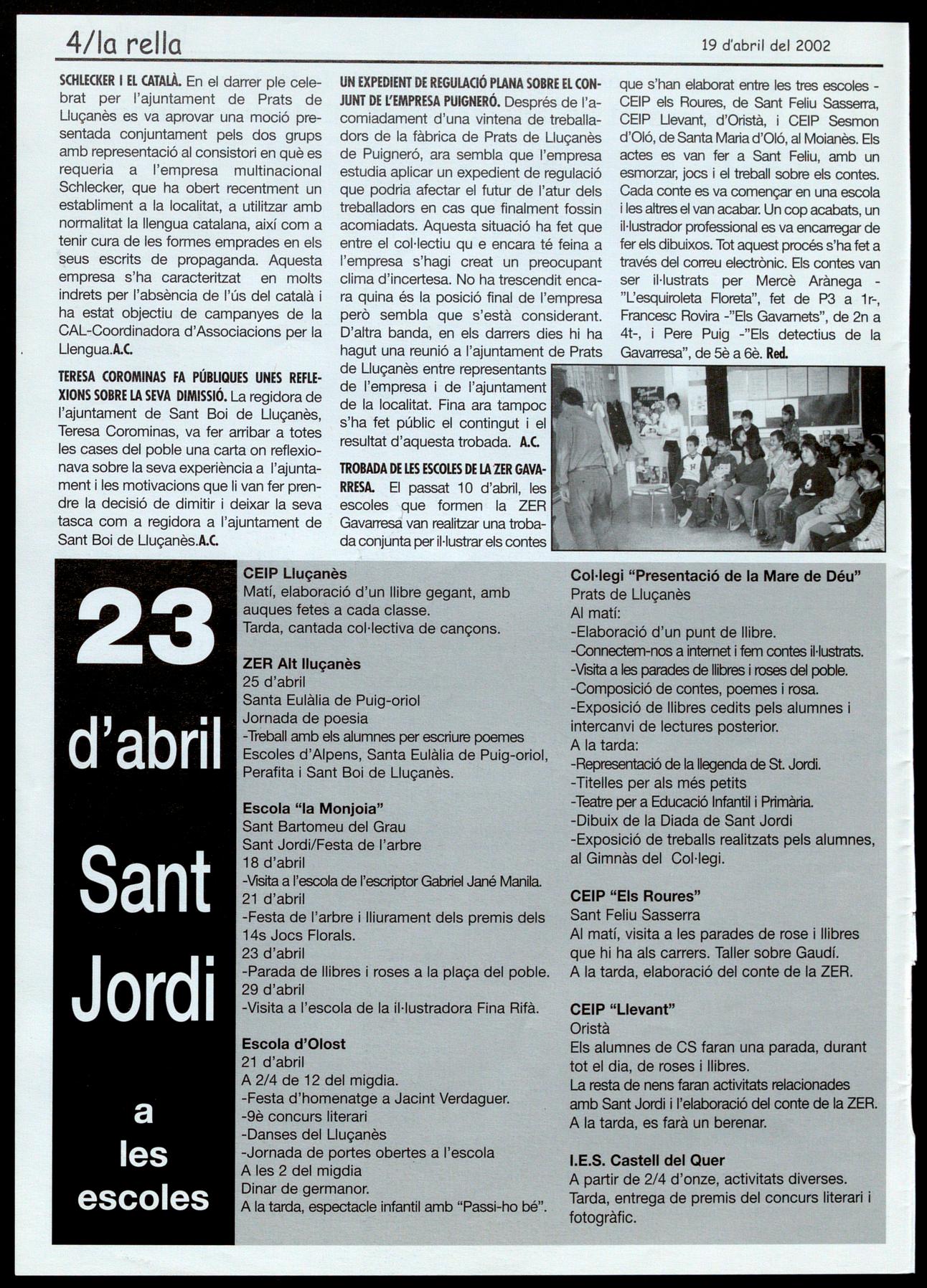 Parlamentàriasobre organilzacióterritorial. Prats de I.Iucœès. - Festa de Sant Jordi. AI matí, rnsso i concert de la Coral SantJordi, del dub. Dinar de germanor. A la tarda, teatre amb Grup de teatre Pep i teatre musical amb dak and.roll. Seguidament, berenar. Organilza, dub de jubilats SantJordi.