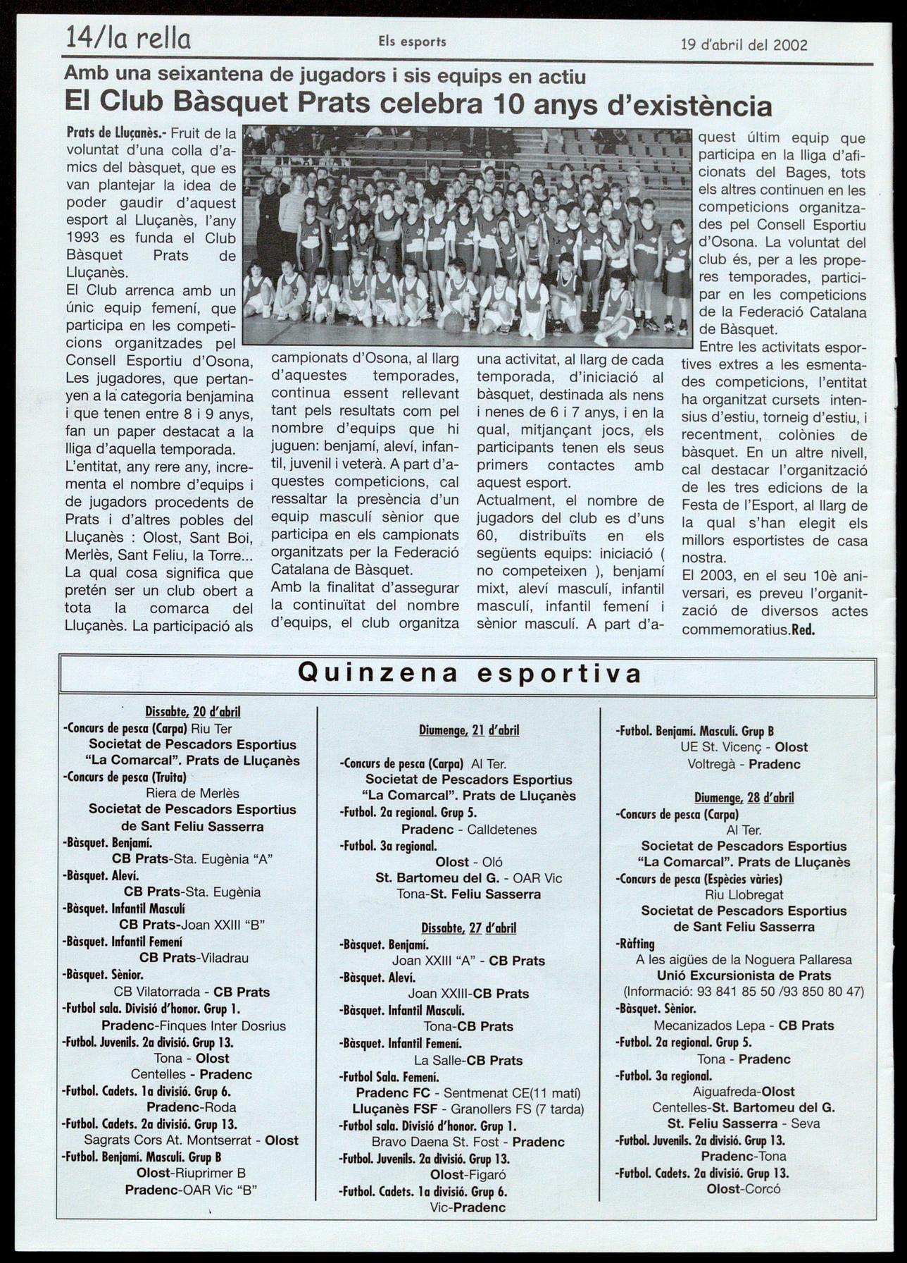 cianats del Bages, tots van plantejar la idea de els altres continuen en les poder gaudir d'aquest competicions organitzaesport al Lluçanès, l'any des pel Consell Esportiu 1993 es funda el Club d'Osona. La voluntat del Bàsquet Prats de club és, per a les propeLluçanès. res temporades, particiEl Club arrenca amb un par en les competicions únic equip femení, que de la Federació Catalana participa en les competi- I""""-I-<!'�.:.L.I. de Bàsquet. cians organitzades pel _� ""__.......:: ...J Entre les activitats esporConsell Esportiu d'Osona, campionats d'Osona, aillarg una activitat, aillarg de cada tives extres a les esmentaLes jugadores, que pertan- d'aquestes temporades, temporada, d'iniciació - al des competicions, l'entitat yen a la categoria benjamina continua essent rellevant bàsquet, destinada als nens ha organitzat cursets intenque tenen entre 8 9 anys, tant pels resultats com pel nenes de 6 7 anys, i en la sius d'estiu, torneig d'estiu, fan un paper destacat a la nombre d'equips que hi qual, mitjançant jocs, els recentment, colònies de lliga d'aquella temporada. juguen: benjamí, aleví, infan- participants tenen els seus bàsquet. En un altre nivell, L'entitat, any rere any, incre- til, juvenil veterà. A part d'a- primers contactes amb cal destacar l'organització menta el nombre d'equips questes competicions, cal aquest esport. de les tres edicions de la de jugadors procedents de ressaltar la presència d'un Actualment, el nombre de Festa de l'Esport, al llarg de Prats d'altres pobles del equip masculí sènior que jugadors del club es d'uns la qual s'han elegit els Lluçanès: Olost, Sant Boi, participa en els campionats 60, distribuïts en els millors esportistes de casa Merlès, Sant Feliu, la Torre... organitzats per la Federació següents equips: iniciació ( nostra. La qual cosa significa que Catalana de Bàsquet. no competeixen ), benjamí El 2003, en el seu 10è anipretén ser un club obert a Amb la finalitat d'assegurar mixt, aleví masculí, infantil versari, es preveu I'organittota la comarca del la continuïtat del nombre masculí, infantil femení i zació de diversos actes Lluçanès. La participació als d'equips, el club organitza sènior masculí. A part d'a- commemoratius.Red.