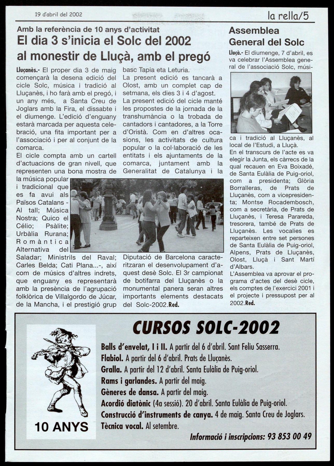 Uucà.- Solc - 2002/1Oanys. Pregód'inauguraciódelXè cide Solc, música i tradició al Uuçanès, al monestir de Uuçà, a les9 del vespre. Seguidament, aduaciómusical amb el grup Psàlite (Vallès-Maresme).