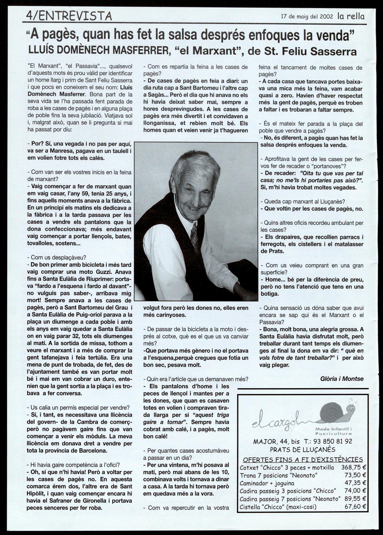 "El Marxant", "el Passavia" qualsevol d'aquests mots és prou vàlid per identificar un home llarg prim de Sant Feliu Sasserra que pocs en coneixem el seu nom: Lluís Domènech Masferrer. Bona part de la seva vida se l'ha passada fent parada de roba a les cases de pagès i en alguna plaça de poble fins la seva jubilació. Viatjava sol i, malgrat això, quan se li pregunta si mai ha passat por diu:
