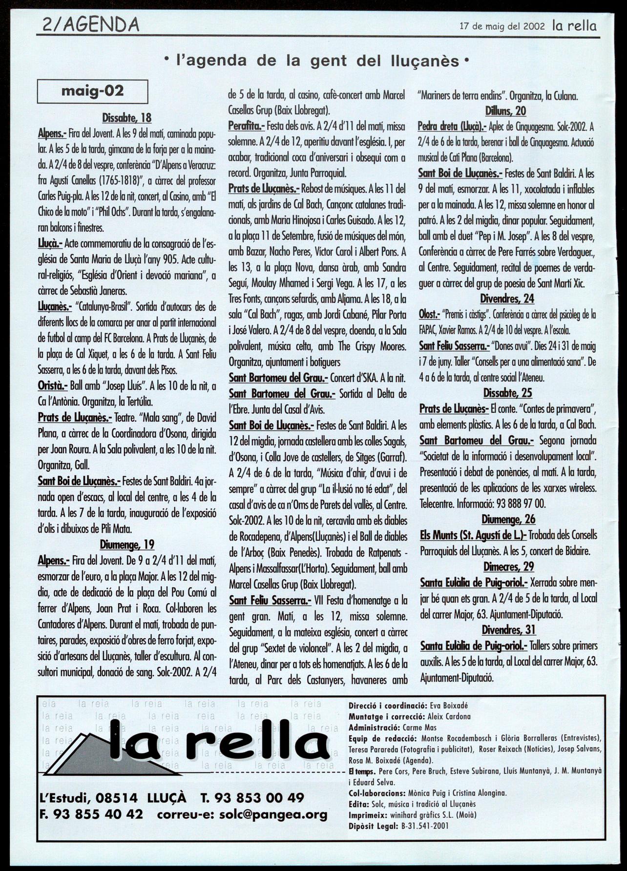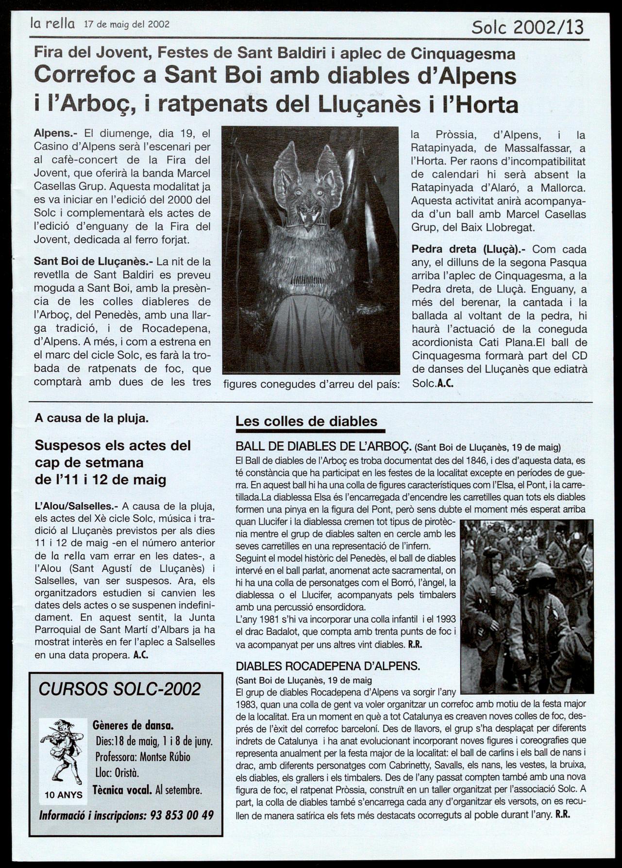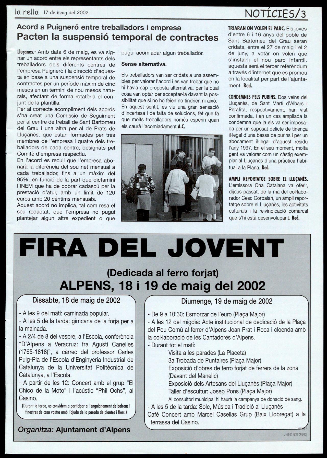 Alpens.- Fira del Jovent. De 9 a 2/4 d'lI del matí esmorzar de l'euro, a la plaçaMajor. Ales 12 del migdia, acte de dedicació de la plaça del Pou Comú al ferrer d'Alpens, Joan Prat i Roca. Col·laboren les Cantadores d'Alpens. Durant el matí, trobada de puntaires,parades,exposició d'obresdeferro forjat, exposició d'artesans del Uuçanès, taller d'escuhura. AI consuhori municipal, donació de song. SoIc-2002. A 2/4