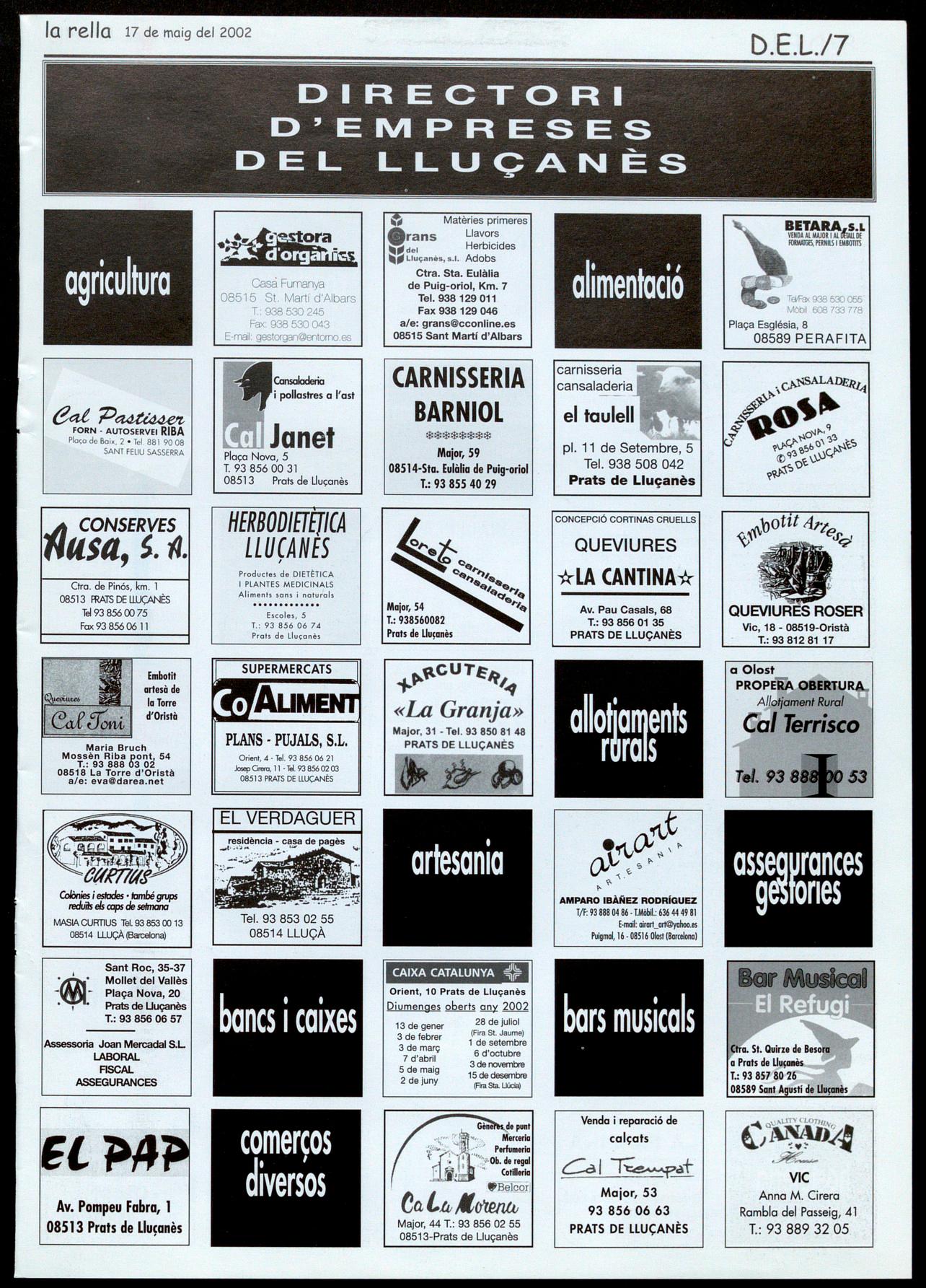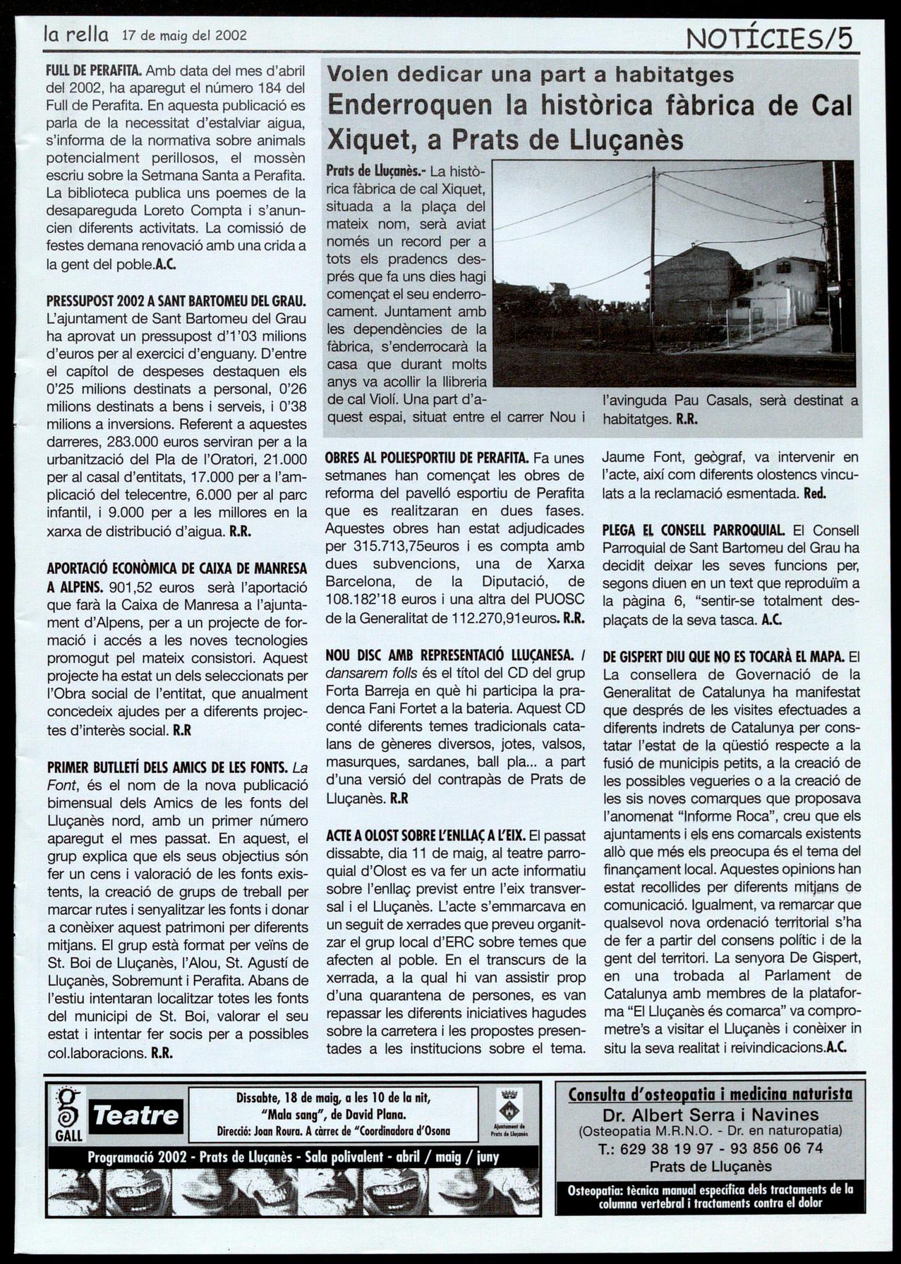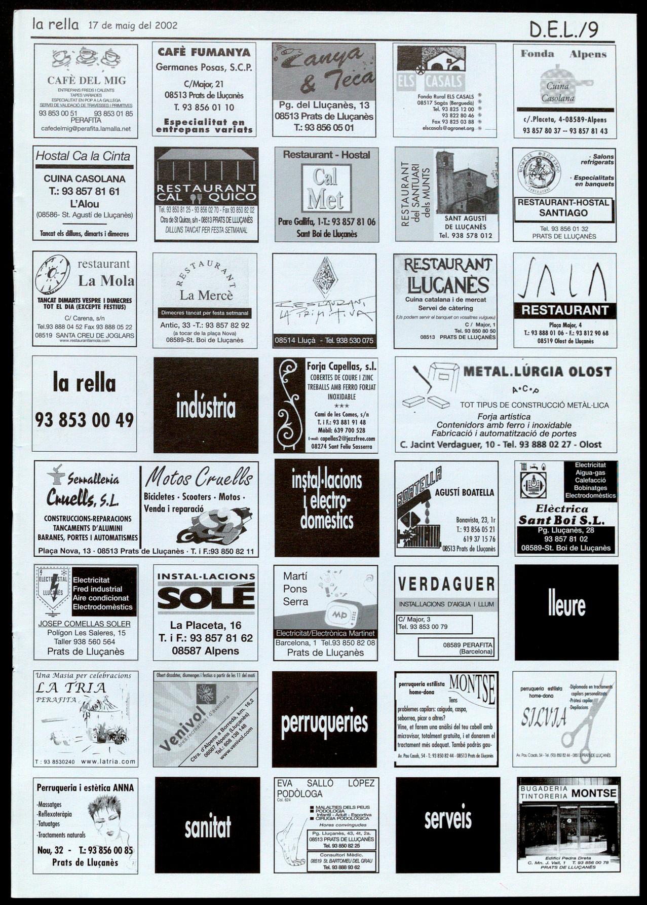 Alpens.- Fira del Jovent. De 9 a 2/4 d'lI del matí esmorzar de l'euro, a la plaçaMajor. Ales 12 del migdia, acte de dedicació de la plaça del Pou Comú al ferrer d'Alpens, Joan Prat i Roca. Col·laboren les Cantadores d'Alpens. Durant el matí, trobada de puntaires,parades,exposició d'obresdeferro forjat, exposició d'artesans del Uuçanès, taller d'escuhura. AI consuhori municipal, donació de song. SoIc-2002. A 2/4