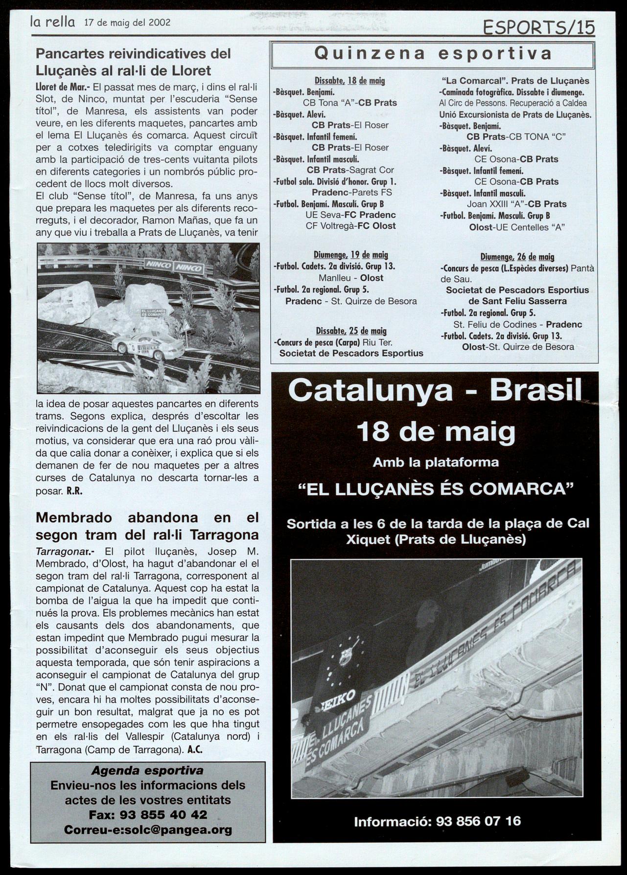 Lloret de Mar.- El passat mes de març, dins el ral·li Slot, de Ninco, muntat per l'escuderia "Sense títol", de Manresa, els assistents van poder veure, en les diferents maquetes, pancartes amb el lema El Lluçanès és comarca. Aquest circuït per a cotxes teledirigits va comptar enguany amb la participació de tres-cents vuitanta pilots en diferents categories un nombrós públic procedent de llocs molt diversos.