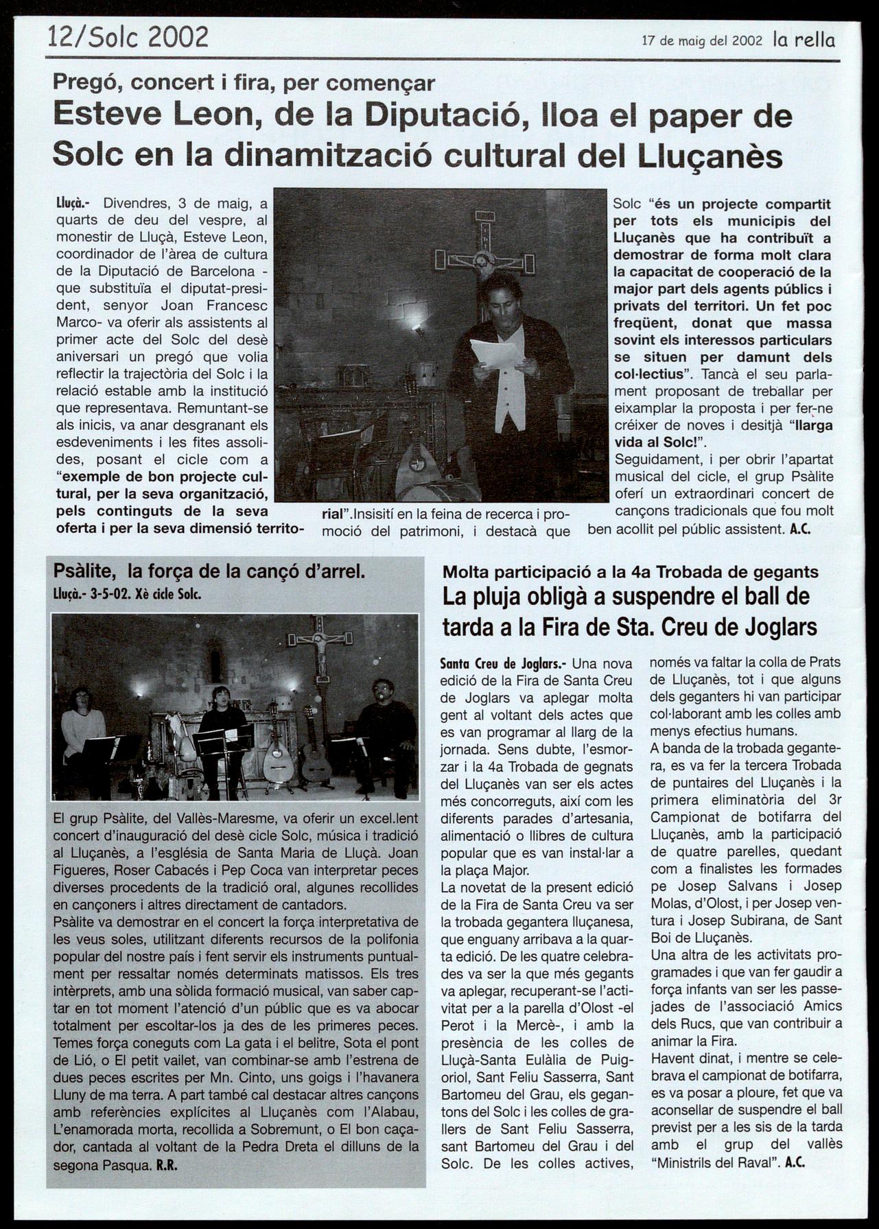 L'Alou/Salselles.- A causa de la pluja, els actes del Xè cicle Solc, música tradició al Lluçanès previstos per als dies 11 12 de maig -en el número anterior de la rella vam errar en les dates-, a l'Alou (Sant Agustí de Lluçanès) i Salselles, van ser suspesos. Ara, els organitzadors estudien si canvien les dates dels actes o se suspenen indefinidament. En aquest sentit, la Junta Parroquial de Sant Martí d'Albars ja ha mostrat interès en fer l'aplec a Salselles en una data propera. A.C.