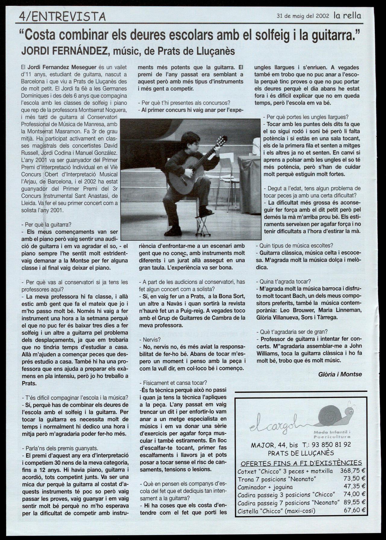 El Jordi Fernandez Meseguer és un vailet d'11 anys, estudiant de guitarra, nascut a Barcelona que viu a Prats de Lluçanès des de molt petit. El Jordi fa 6è a les Germanes Dominiques des dels 6 anys que compagina l'escola amb les classes de solfeig piano que rep de la professora Montserrat Noguera, més tard de guitarra al Conservatori Professiojtal de Música de Manresa, amb la Montserrat Masramon. Fa 3r de grau mitjà. Ha�'participat activament en classes mag�trals dels concertistes David Russell, JSJrdi Codina Manuel González. L'any 20d� va ser guanyador del Primer Premi d'lnterpretació Individual en el Vlè Concurs ,Obert d'Interpretació Musical ¡;:;;.......;:=::;;;;;;=:.:::..;;;: