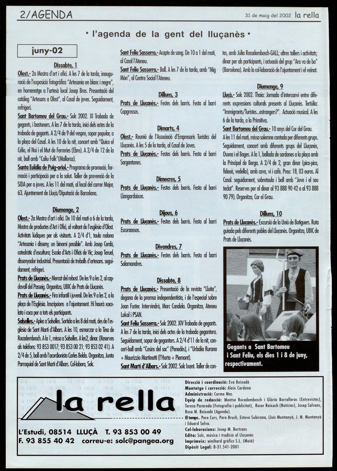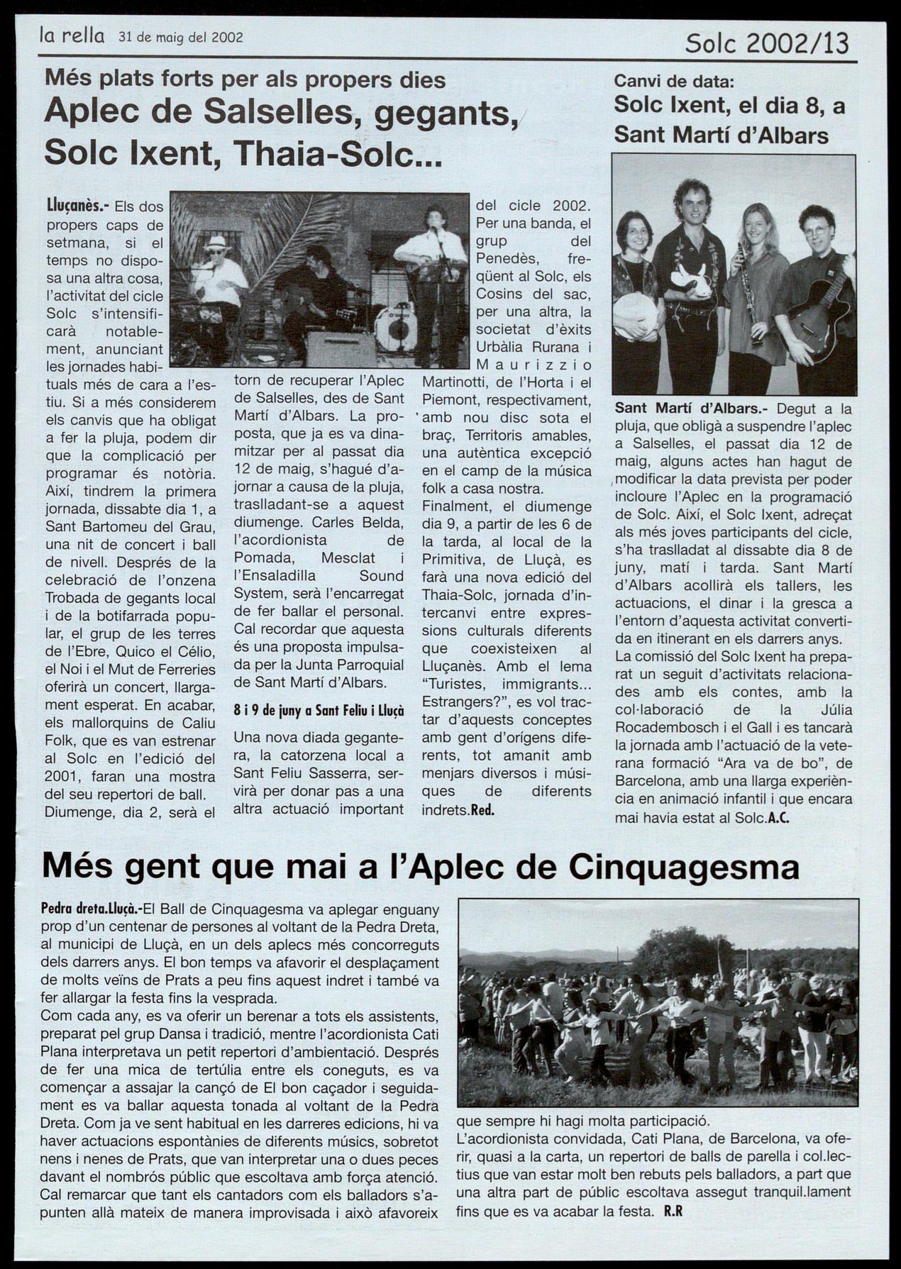 Sant Felu Sasserra.-Solc 2002.XIVTrobada de gegants. A les 7 de la tarda, inid dels actes de la trobada gegantera. Seguidament,soparde geganters.A2/4d'll de la nn, concert-ball amb "Cosins del sac" (Penedès), i "Urbàlia Rurana + Maurizzio Martinotti (l'Horta + Piemont). SantMII1íci'Albars.- Solc 2002.SolcIxent.Tallerde con-