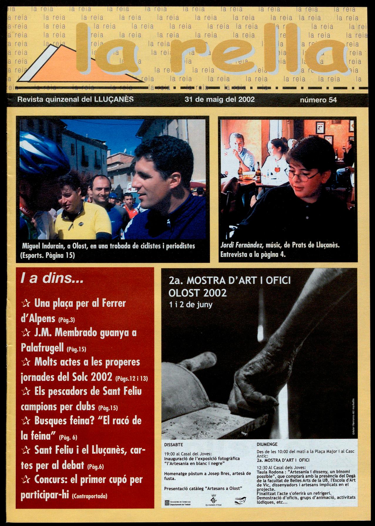 Olost.- Amb el patrocini de "Segura Viudas", es va organitzar, per segon any, una trobada de periodistes vinculats al món de les bicicletes, amb la participació de ciclistes professionals i exprofessionals, així com d'aficionats de diferents clubs ciclistes. Si l'any passat l'estrella de la diada va ser el ciclista castellà Perico Delgado, enguany la figura destacada va ser el corredor basc, Miguel Indurain. Indurain, natural de la localitat navarresa de Villaba, guanyador de cinc edicions del Tour de France, va ser a Olost per participar d'aquesta trobada que promou I'olostenc Òscar Pitarch, de la Unió Ciclista de :...._---I Sants, que consisteix en un recorregut d'una cinquantena de quilòmetres -enguany dues voltes al circuit OlostPrats-Olost- un dinar per als participants. D'altres cares conegudes del món de la bicicleta que hi van ser presents eren en Melcior Mauri, d'Osona, en Jordi Riera, fins ara berguedà aviat lluçanès, i el periodista esportiu de TV3, Arcadi Alibés. Membres de la plataforma "el Lluçanès és comarca" van penjar una pancarta al punt de sortida, al costat de la qual es va fotografiar el corredor navarrès. A.C.