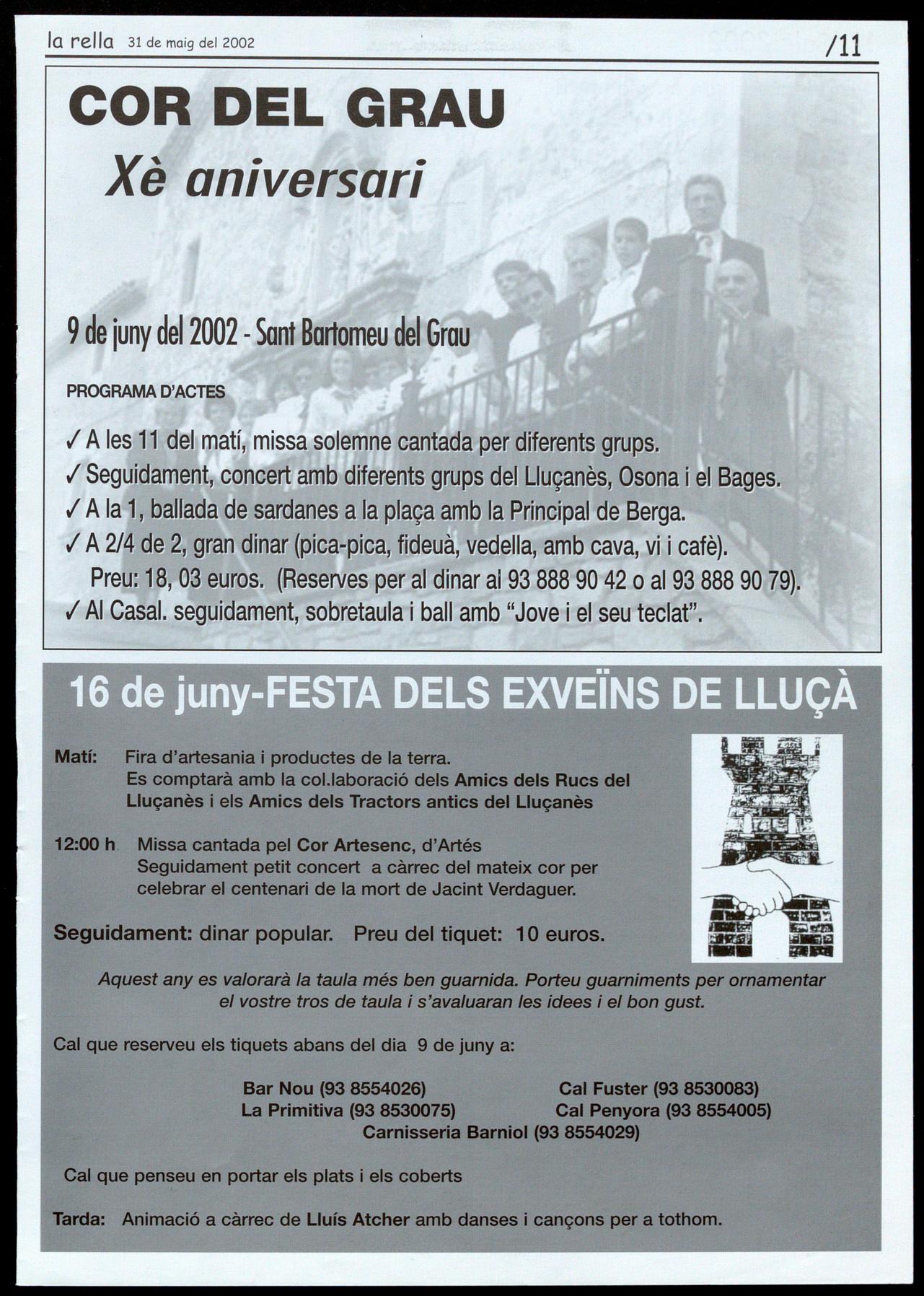 Sant Bartomeu del Grau.- 10 anysdel Cor del Grau. Ales 11 delmatí,missasolemnecantadaperdiferentsgrups. Seguidament, concert amb diferents grups del Uuçanès, Osonai el Bages. Ala l, ballada desardanes a la plaça amb la Prindpol de Berga. A 2/4 de 2, gran dinar (piea-piea, fideuà, vedella), amb cava, vi cafè. Preu: 18, 03 euros. AI Casal. seguidament, sobretaula i ball amb "Jove i el seu teclat". Reserves per al dinar 0193 888 90 42 o 0193 888 90 79}. Organilza, Cor el Grau.
