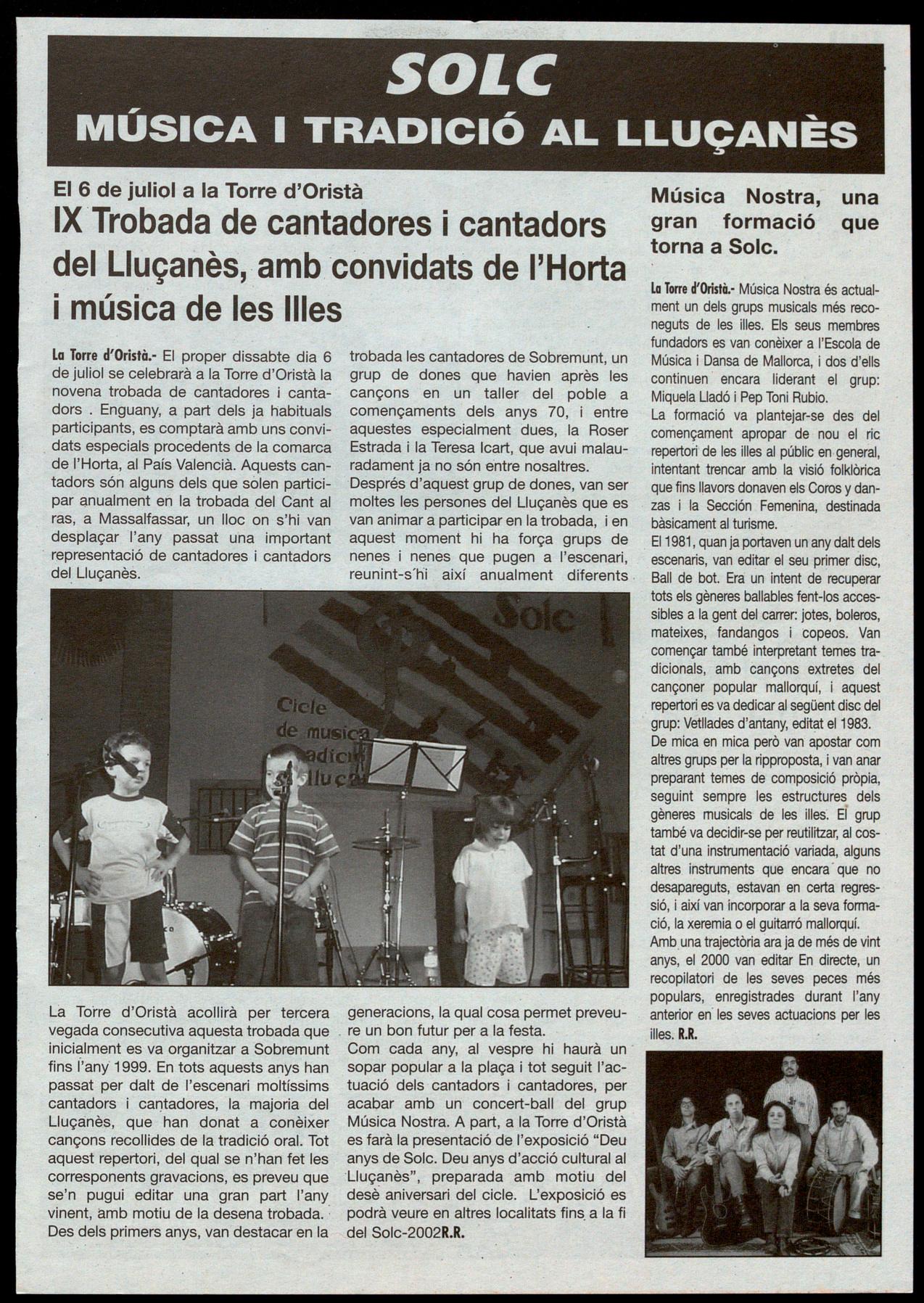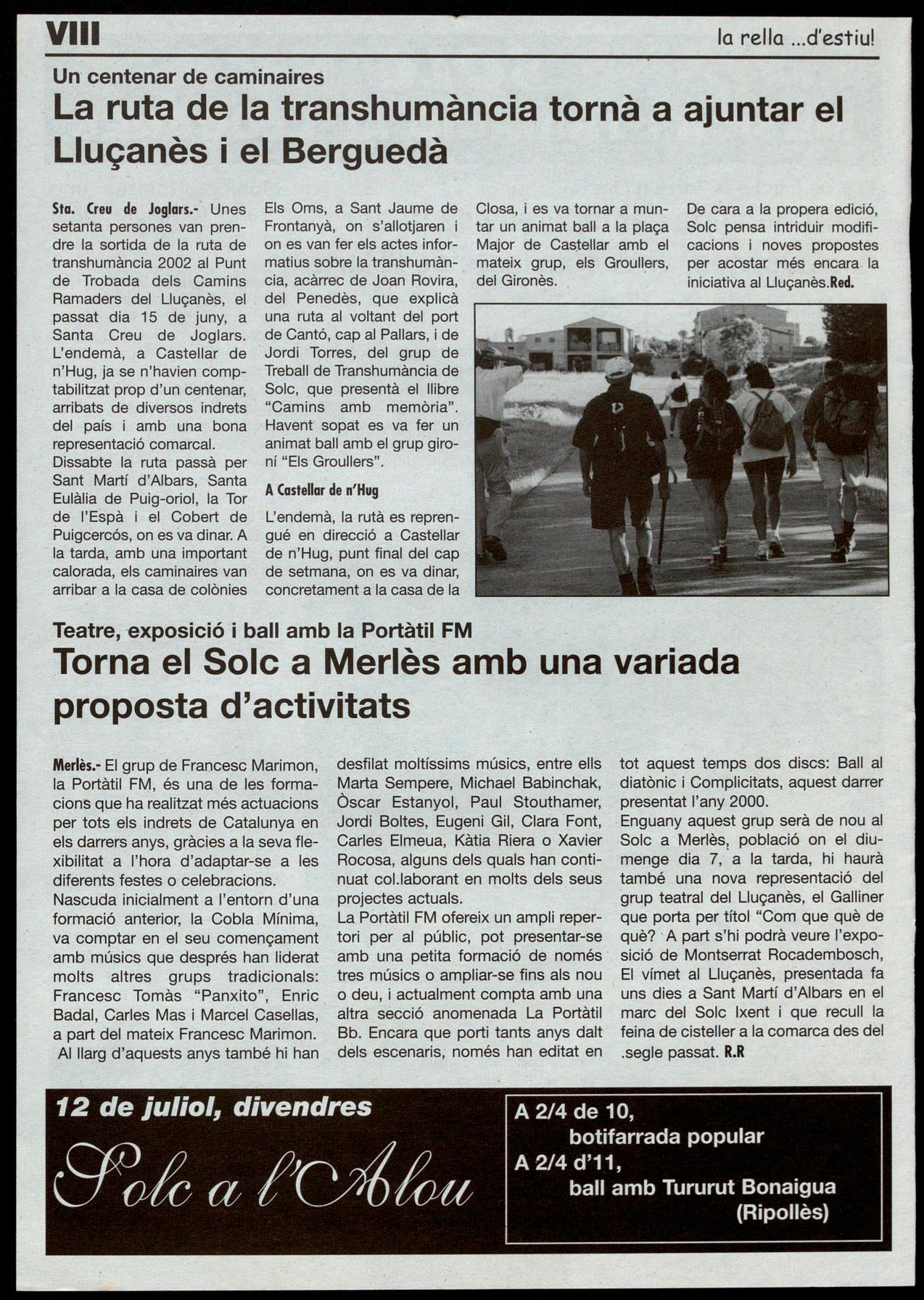 FESTA DELS EXVEïNS DE LLUÇÀ 2002. El passat dia 16 de juny, Lluçà acollí novament la festa dels exveïns. Com cada any se seguí els actes tingueren molta participació, començant per la missa. En la fira d'artesania productes de la terra hi hagué representació de cistelleria, formatges artesans, herbes remeieres, objectes de torneria, escuts deli Lluçanès escolpits sobre pedra i altres parades on els assistents van poder participar. AI dinar hi assistiren unes 500 persones. La tarda s'animà amb l'actuació de Lluís Atcher amb el campionat de tir amb arc que s'organitzà que tingué molt d'èxiU.B.