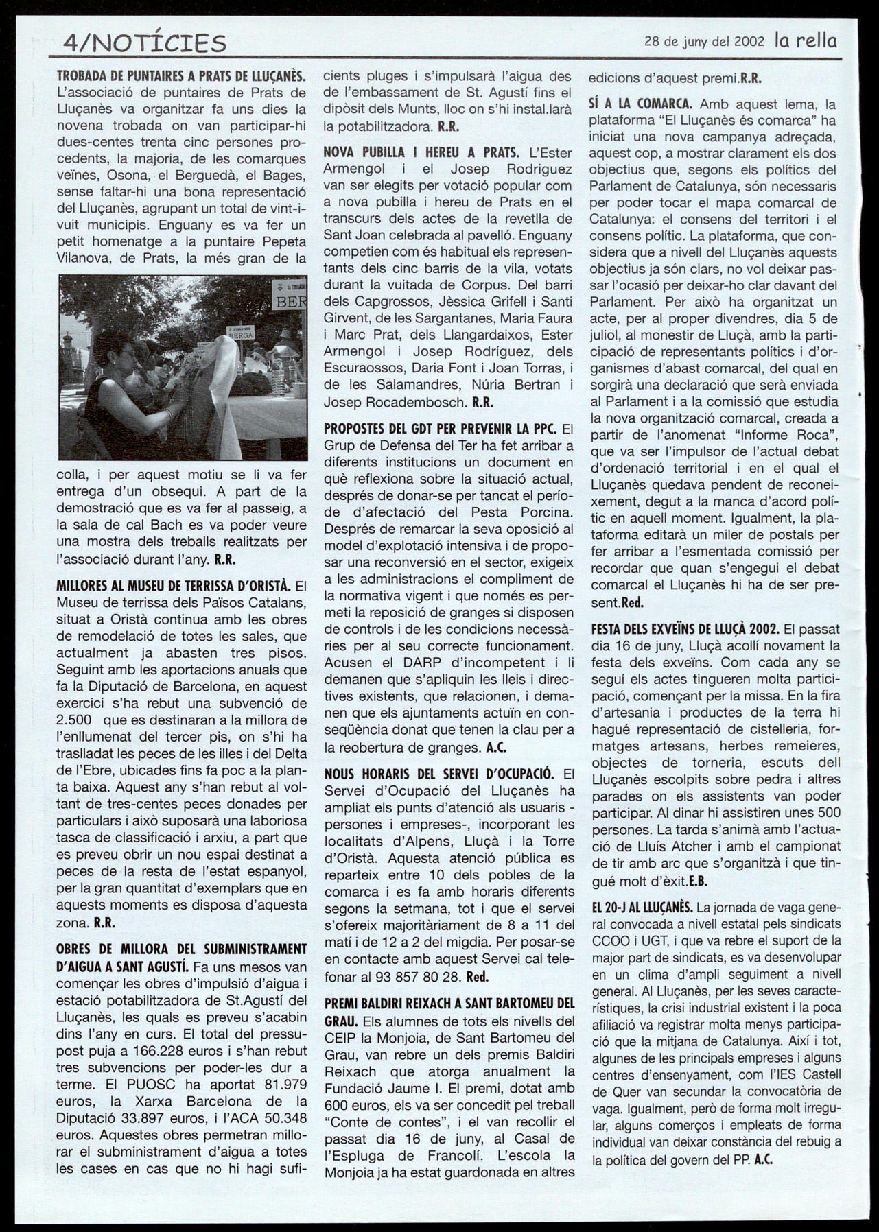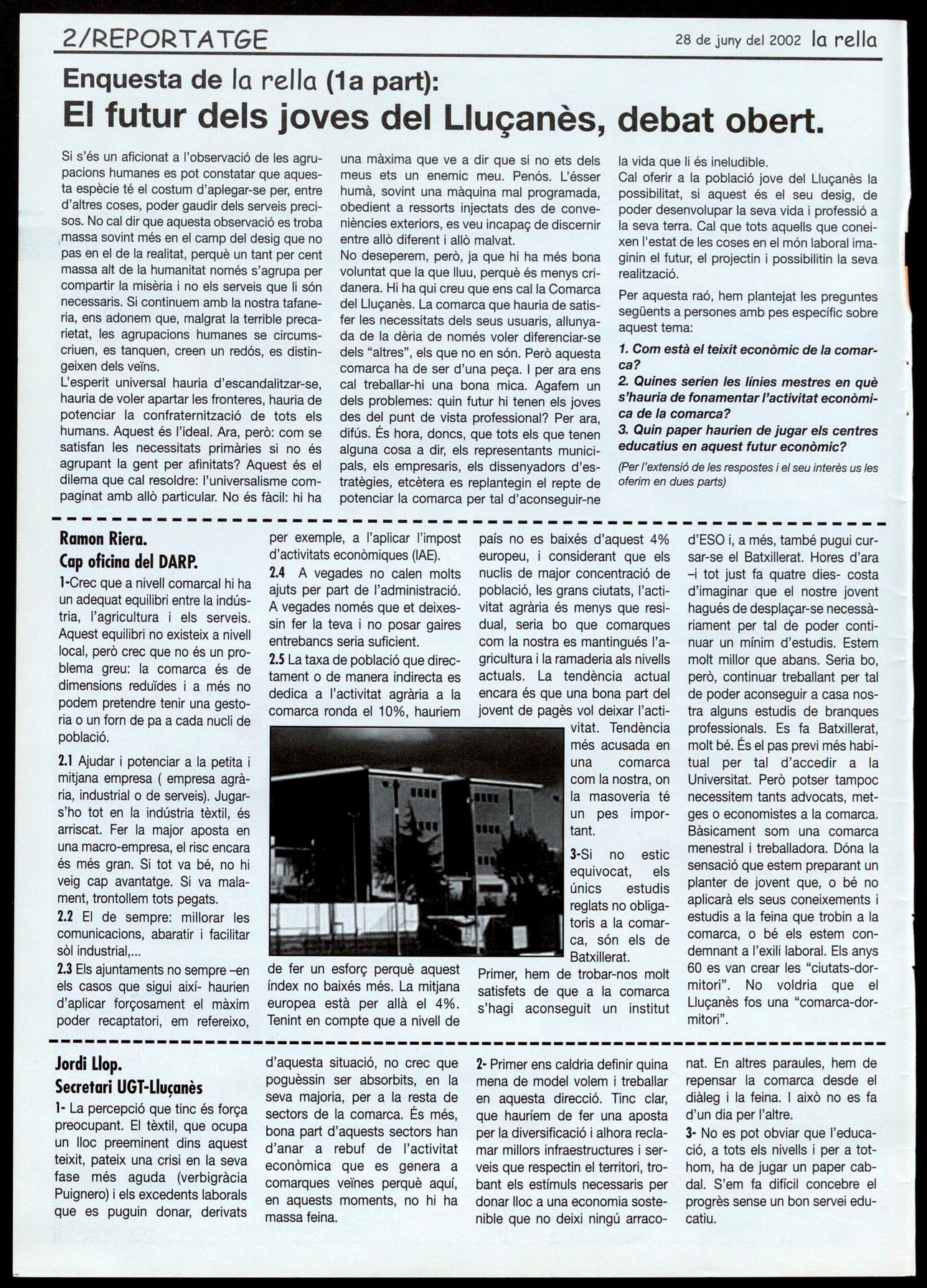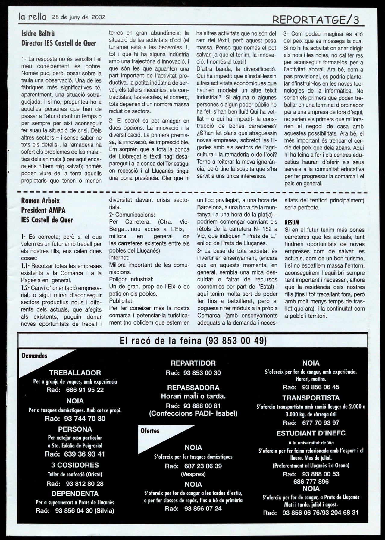 EL 20-J AL LLUÇANÈS. La jornada de vaga general convocada a nivell estatal pels sindicats CCOO UGT, que va rebre el suport de la major part de sindicats, es va desenvolupar en un clima d'ampli seguiment a nivell general. AI Lluçanès, per les seves característiques, la crisi industrial existent la poca afiliació va registrar molta menys participació que la mitjana de Catalunya. Així tot, algunes de les principals empreses alguns centres d'ensenyament, com l'lES Castell de Quer van secundar la convocatòria de vaga. Igualment, però de forma molt irregular, alguns comerços empleats de forma individual van deixar constància del rebuig a la política del govern del PP. A.C.
