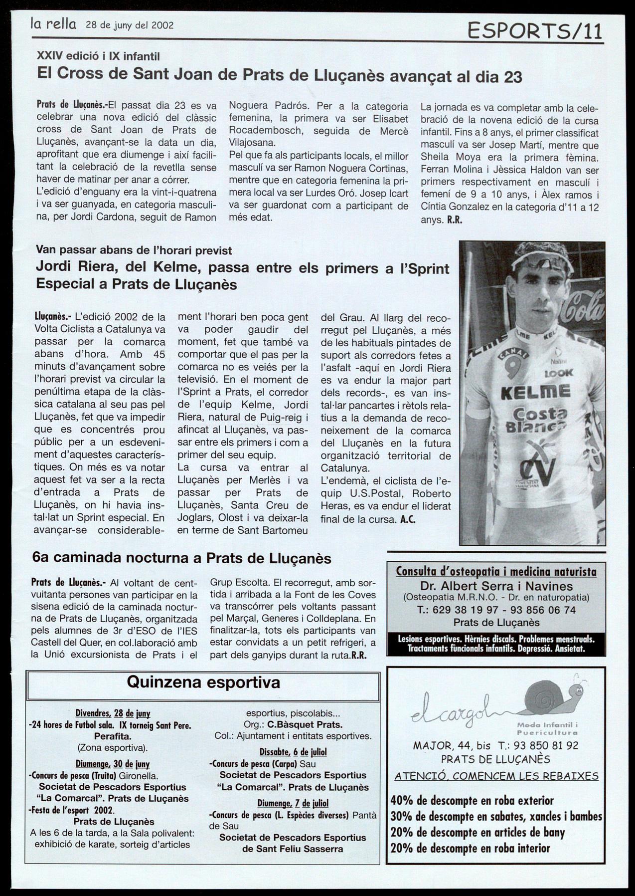 Prats de Lluçanès.-EI passat dia 23 es va celebrar una nova edició del clàssic cross de Sant Joan de Prats de Lluçanès, avançant-se la data un dia, aprofitant que era diumenge així facilitant la celebració de la revetlla sense haver de matinar per anar a córrer. L'edició d'enguany era la vint-i-quatrena va ser guanyada, en categoria masculina, per Jordi Cardona, seguit de Ramon