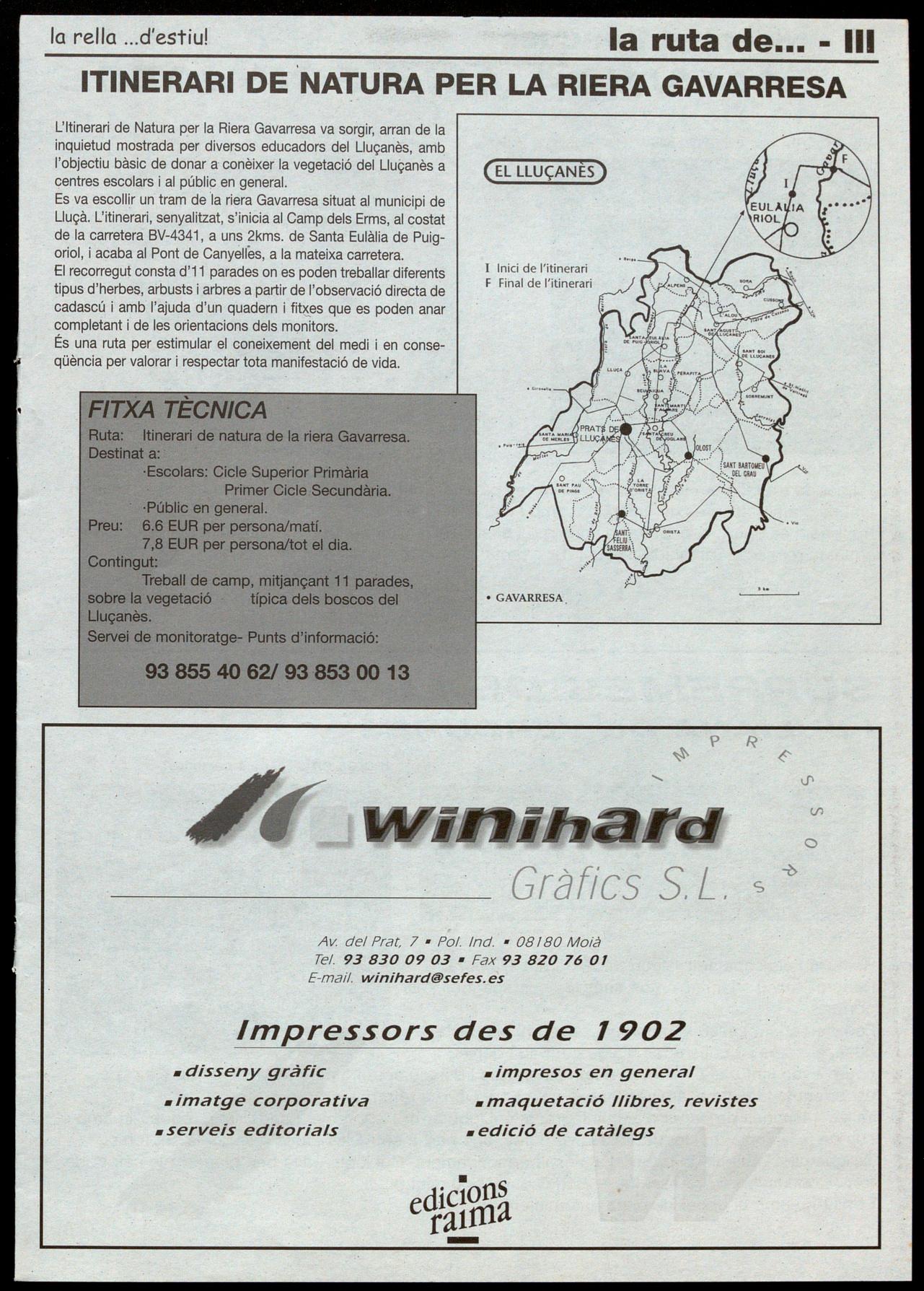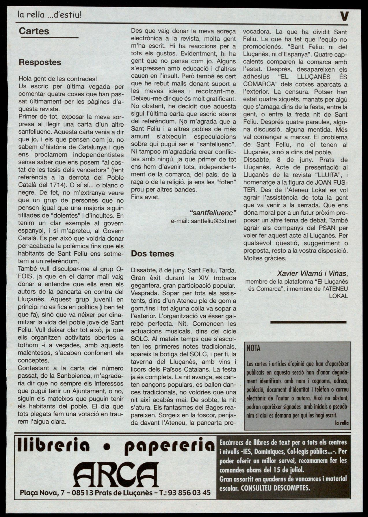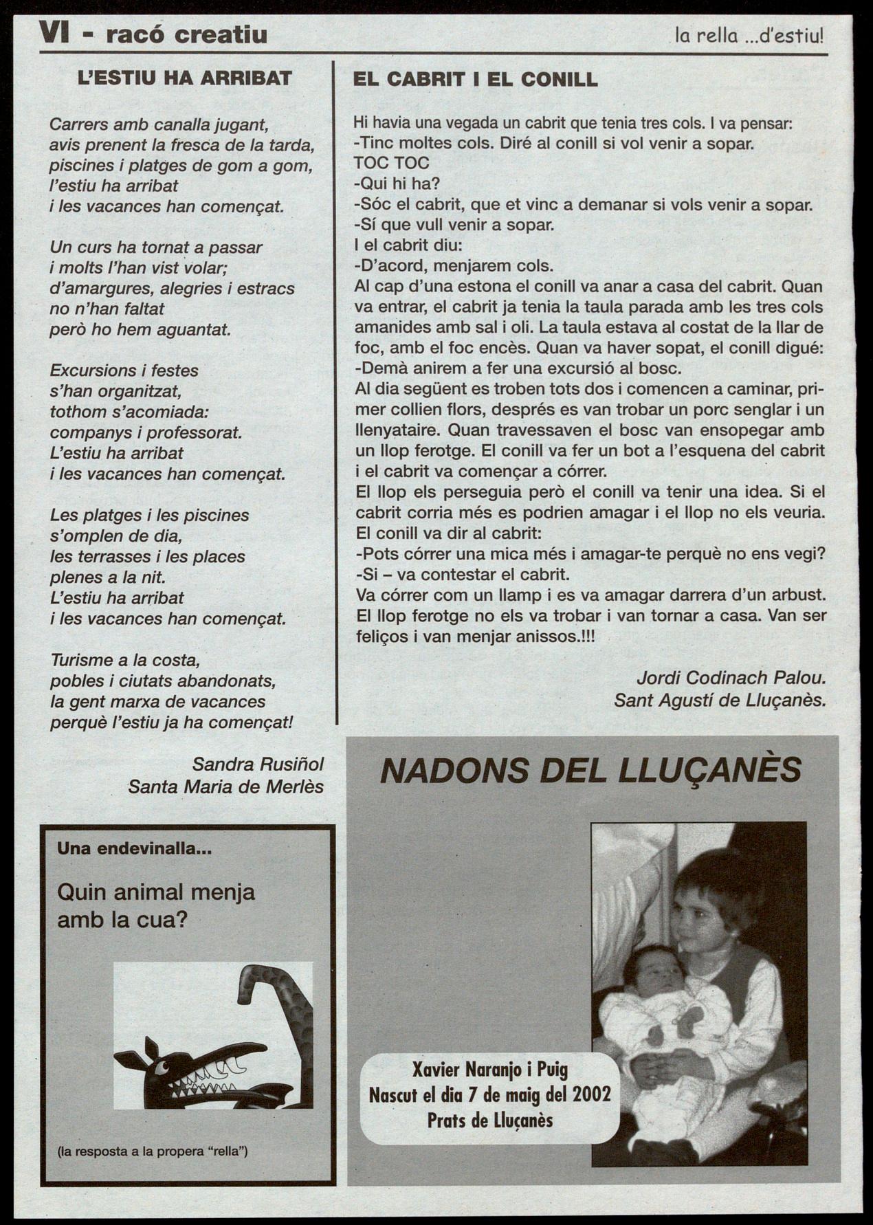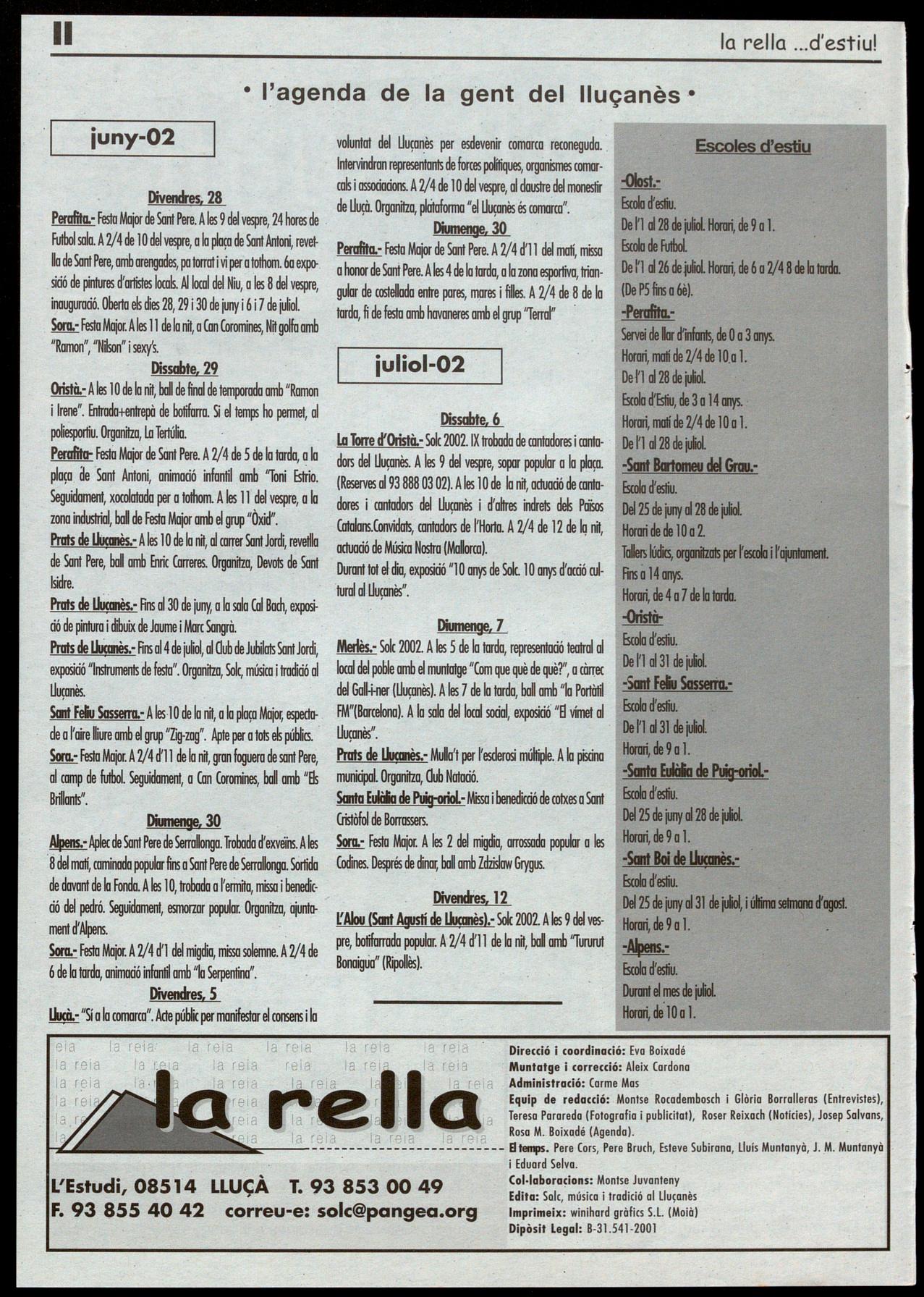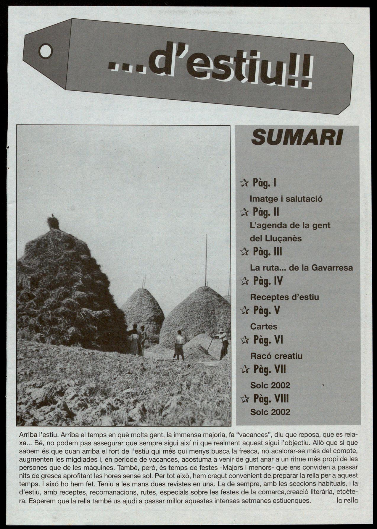 Arriba l'estiu. Arriba el temps en què molta gent, là immensa.majoria, fa "vacances", diu que reposa, que es relaxa Bé, no podem pas assegurar que sempre sigui així ni que realment aquest sigui l'objectiu. Allò que sí que sabem és que quan arriba el fort de l'estiu qui més qui menys busca la fresca, no acalorar-se més del compte, augmenten les migdiades i, en període de vacances, acostuma a venir de gust anar a un ritme més propi de les persones que de les màquines. També, però, és temps de festes -Majors i menors- que ens conviden a passar nits de gresca aprofitant les hores sense sol. Per tot això, hem cregut convenient de.preparar la rella per a aquest temps. aixó ho hem fet. Teniu a les mans dues revistes en una. La de sempre, amb les seccions habituals, la d'estiu, amb receptes, recomanacions, rutes, especials sobre les festes de la comarca,creació literària, etcètera. Esperem que la rella també us ajudi a passar millor aquestes intenses setmanes estiuenques. la rella