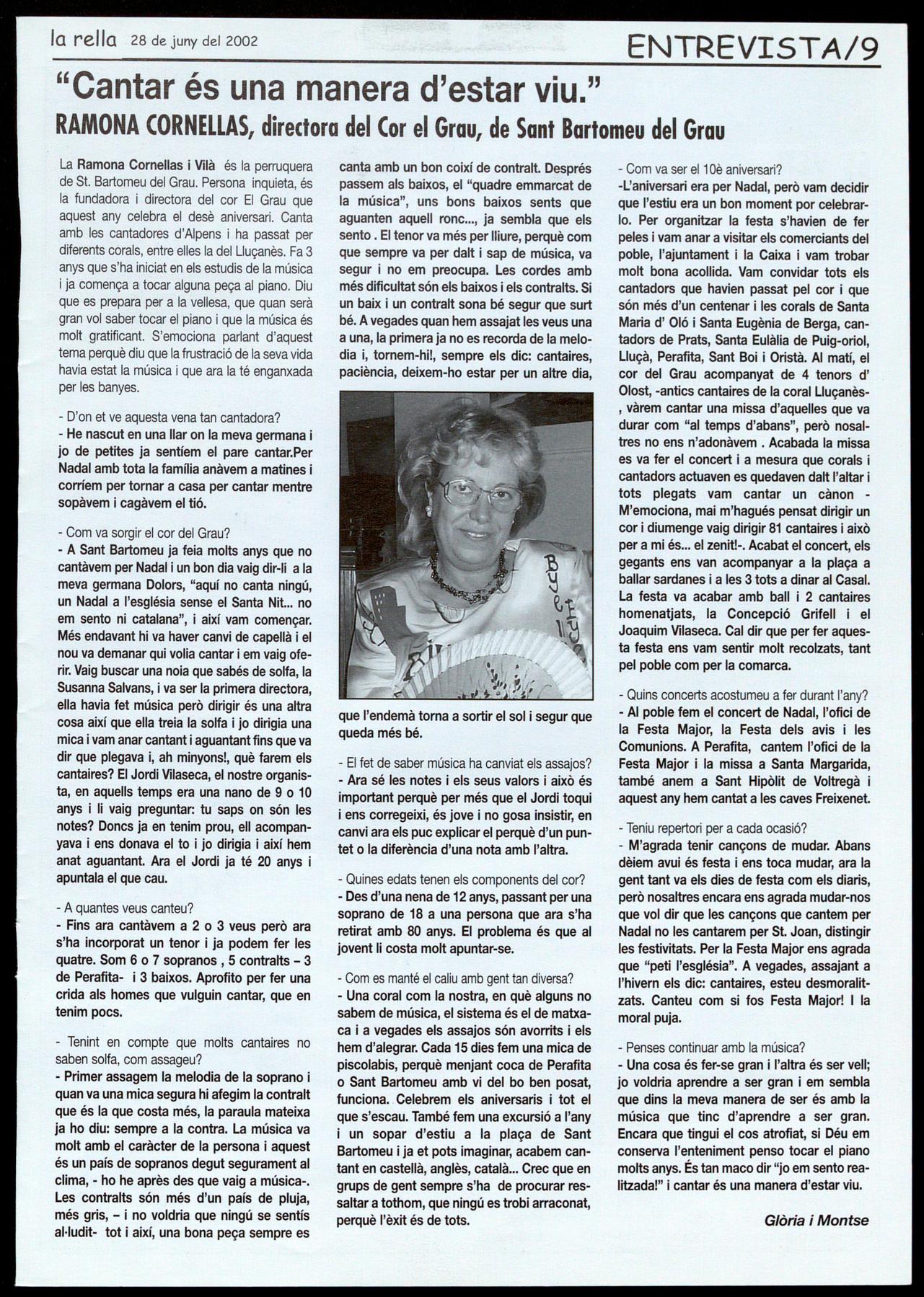 -L'aniversari era per Nadal, però vam decidir que l'estiu era un bon moment por celebrarlo. Per organitzar la festa s'havien de fer peles i vam anar a visitar els comerciants del poble, l'ajuntament i la Caixa i vam trobar molt bona acollida. Vam convidar tots els cantadors que havien passat pel cor i que són més d'un centenar i les corals de Santa Maria d' Oló Santa Eugènia de Berga, cantadors de Prats, Santa Eulàlia de Puig-oriol, Lluçà, Perafita, Sant Boi i Oristà. AI matí, el cor del Grau acompanyat de 4 tenors d' Olost, -antics cantaires de la coral Lluçanèsvàrem cantar una missa d'aquelles que va durar com "al temps d'abans", però nosaltres no ens n'adonàvem Acabada la missa es va fer el concert i a mesura que corals cantadors actuaven es quedaven dalt l'altar tots plegats vam cantar un cànonM'emociona, mai m'hagués pensat dirigir un cor i diumenge vaig dirigir 81 cantaires això per a mi és el zenit!-. Acabat el concert, els gegants ens van acompanyar a la plaça a ballar sardanes a les 3 tots a dinar al Casal. La festa va acabar amb ball i 2 cantaires homenatjats, la Concepció Grifell i el Joaquim Vilaseca. Cal dir que per fer aquesta festa ens vam sentir molt recolzats, tant pel poble com per la comarca.