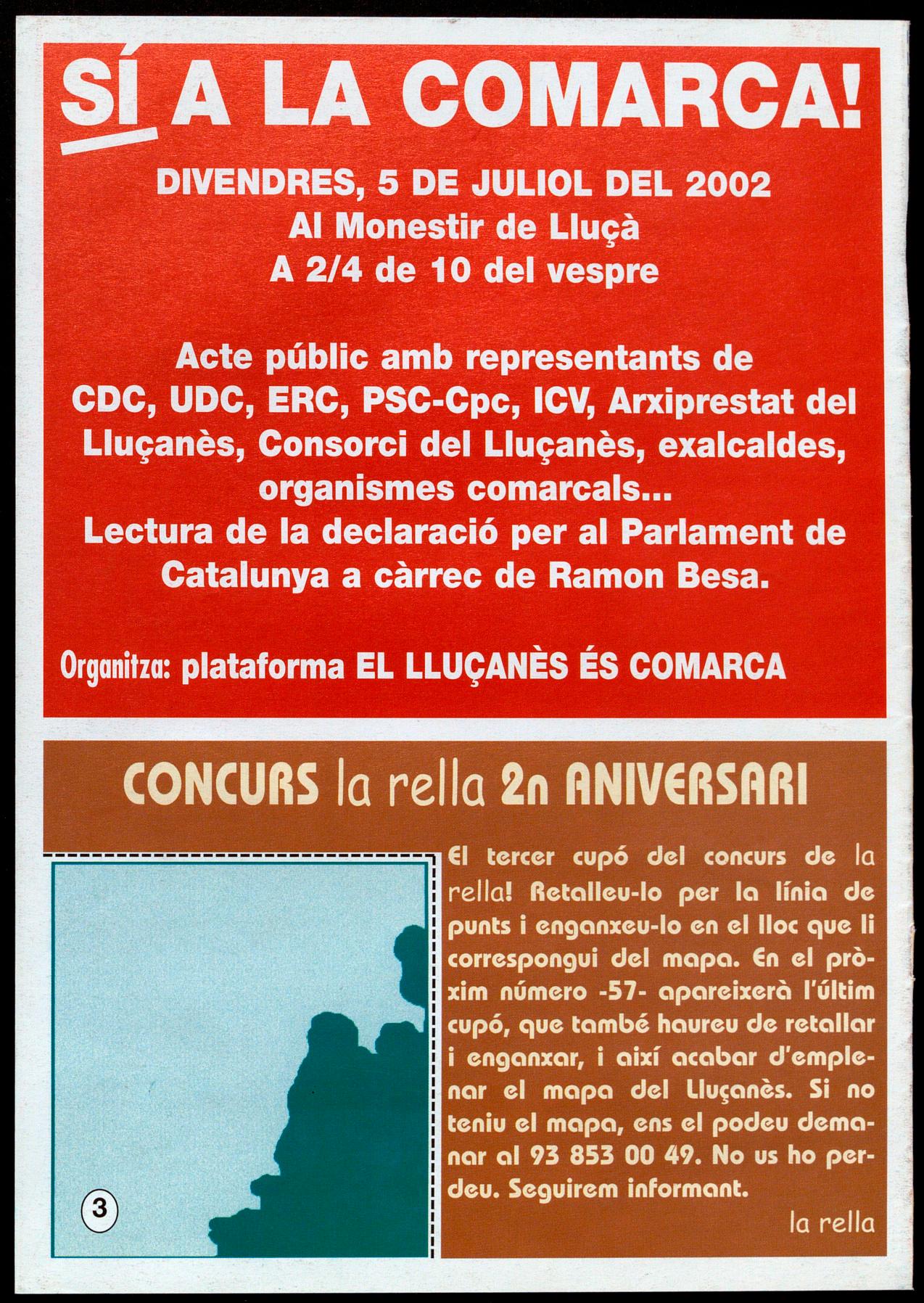 sí A LA COMARCA. Amb aquest lema, la plataforma "El Lluçanès és comarca" ha iniciat una nova campanya adreçada, aquest cop, a mostrar clarament els dos objectius que, segons els polítics del Parlament de Catalunya, són necessaris per poder tocar el mapa comarcal de Catalunya: el consens del territori i el consens polític. La plataforma, que considera que a nivell del Lluçanès aquests objectius ja són clars, no vol deixar passar l'ocasió per deixar-ho clar davant del Parlament. Per això ha organitzat un acte, per al proper divendres, dia 5 de juliol, al monestir de Lluçà, amb la participació de representants polítics d'organismes d'abast comarcal, del qual en sorgirà una declaració que serà enviada al Parlament a la comissió que estudia la nova organització comarcal, creada a partir de l'anomenat "Informe Roca", que va ser l'impulsor de l'actual debat d'ordenació territorial en el qual el Lluçanès quedava pendent de reconeixement, degut a la manca d'acord polític en aquell moment. Igualment, la plataforma editarà un miler de postals per fer arribar a l'esmentada comissió per recordar que quan s'engegui el debat comarcal el Lluçanès hi ha de ser present.Red.