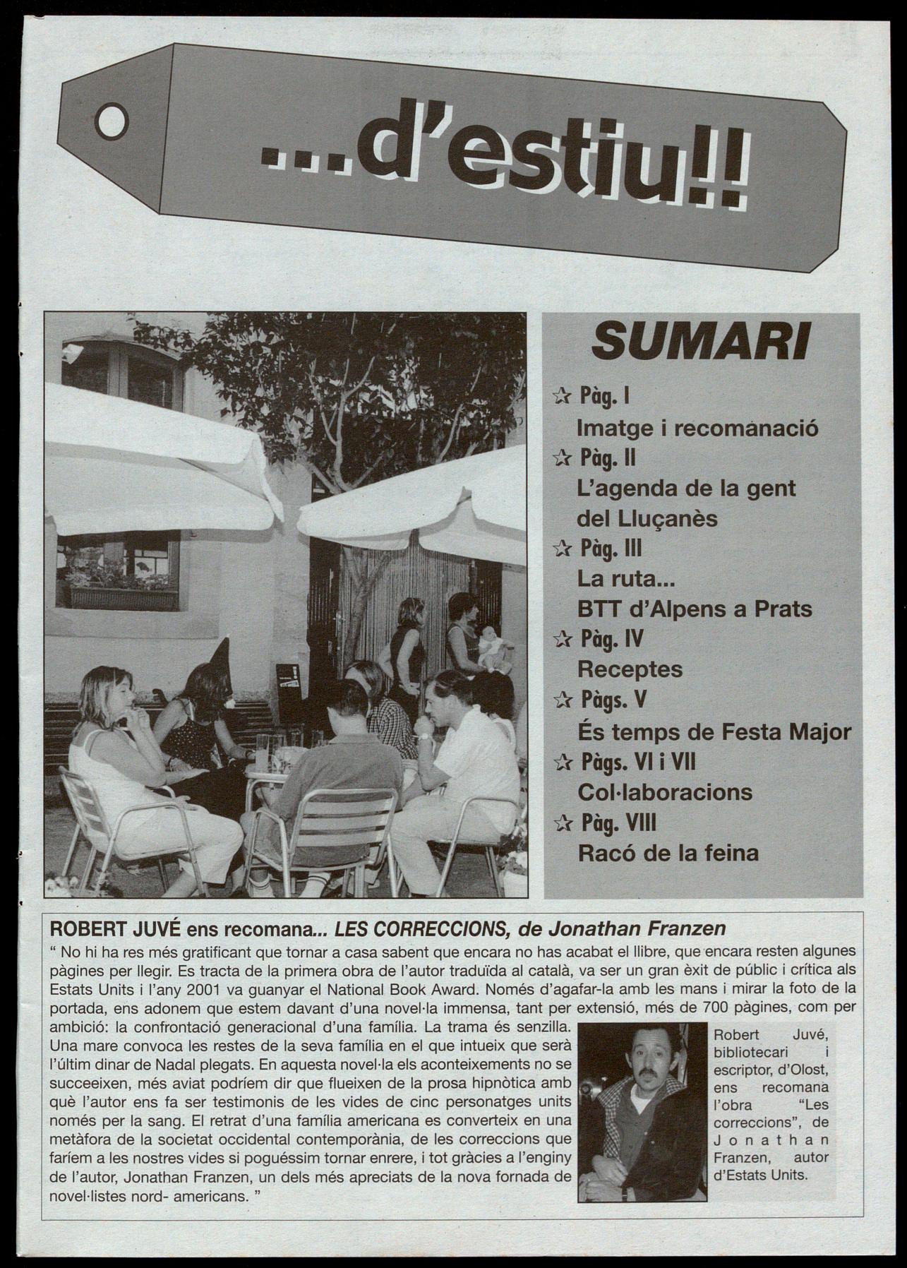 MOLAS I SALVANS GUANYADORS DEL TERCER CAMPIONAT DE BOTIFARRA DEL LLUÇANÈS. Per un error de la redacció, en el darrer número de la revista no van aparèixer els noms dels finalistes els guanyadors del 3r campionat de botifarra del Lluçanès, organitzat en el marc del cicle Solc, música tradició al Lluçanès. Els guanyadors van ser els olostencs Josep Salvans Josep Molas, mentre que la parella que va quedar en segon lloc va ser la formada per Josep Subirana Josep Verdaguer, de Sant Boi de Lluçanès. Red.