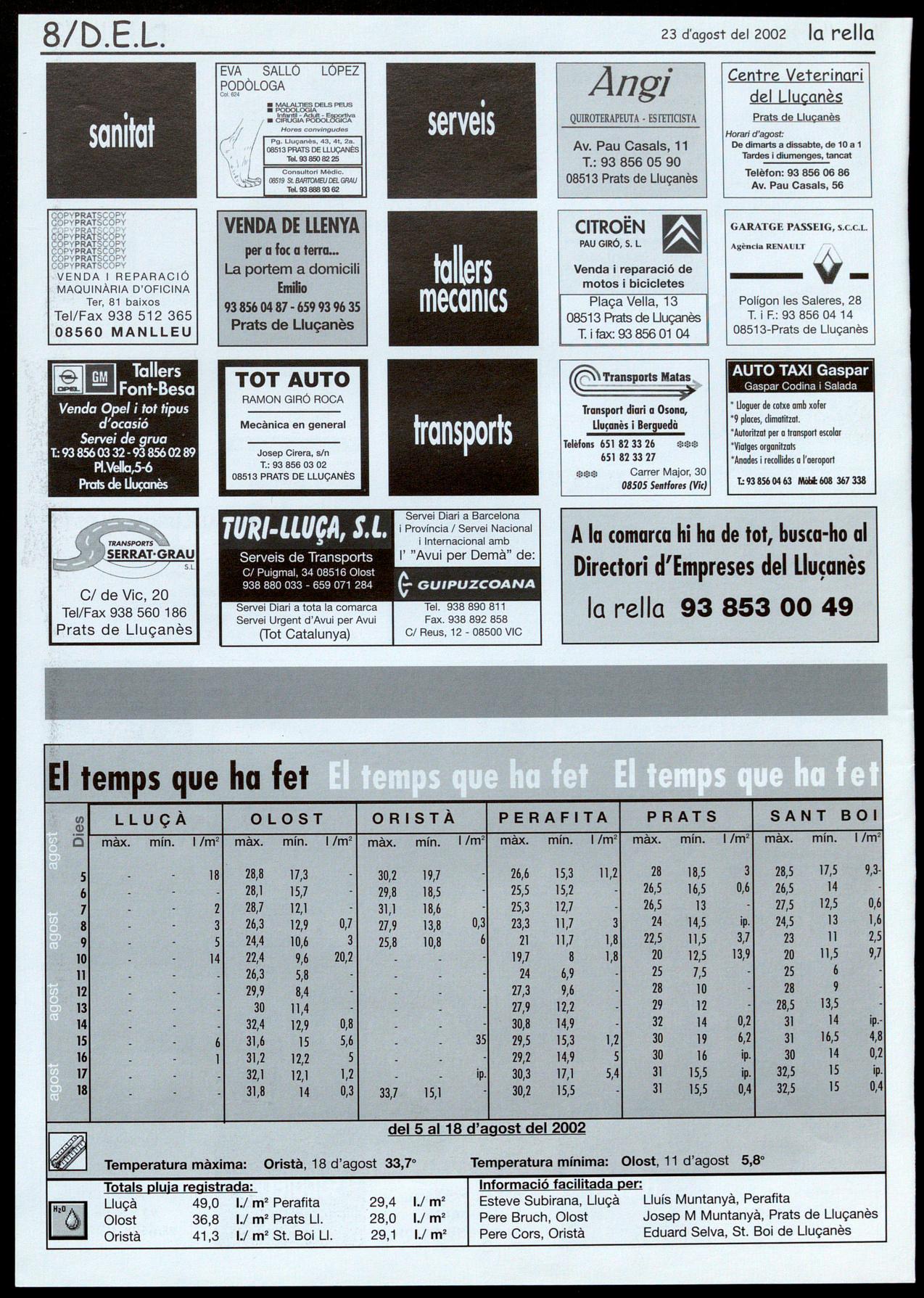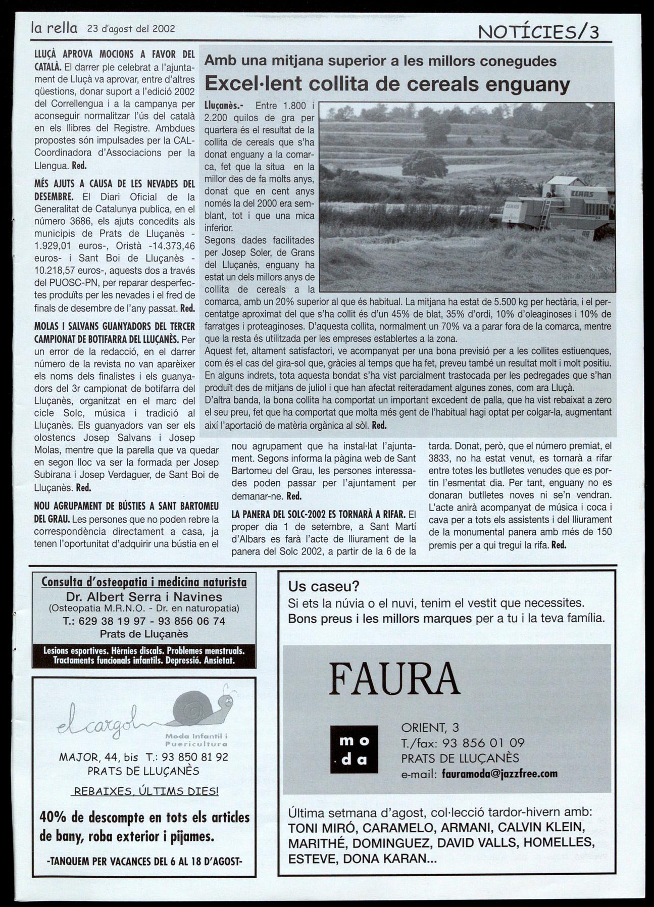 comarca, amb un 20% superior al que és habitual. La mitjana ha estat de 5.500 kg per hectària, el percentatge aproximat del que s'ha collit és d'un 45% de blat, 35% d'ordi, 10% d'oleaginoses 10% de farratges proteaginoses. D'aquesta collita, normalment un 70% va a parar fora de la comarca, mentre que la resta és utilitzada per les empreses establertes a la zona. Aquest fet, altament satisfactori, ve acompanyat per una bona previsió per a les collites estiuenques, com és el cas del gira-sol que, gràcies al temps que ha fet, preveu també un resultat molt i molt positiu. En alguns indrets, tota aquesta bondat s'ha vist parcialment trastocada per les pedregades que s'han produït des de mitjans de juliol que han afectat reiteradament algunes zones, com ara Lluçà. D'altra banda, la bona collita ha comportat un important excedent de palla, que ha vist rebaixat a zero el seu preu, fet que ha comportat que molta més gent de l'habitual hagi optat per colgar-la, augmentant així l'aportació de matèria orgànica al sòl. Red.
