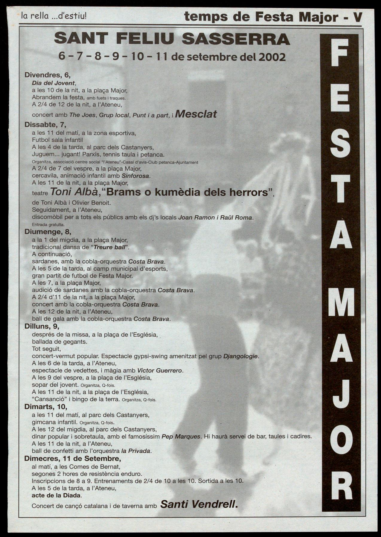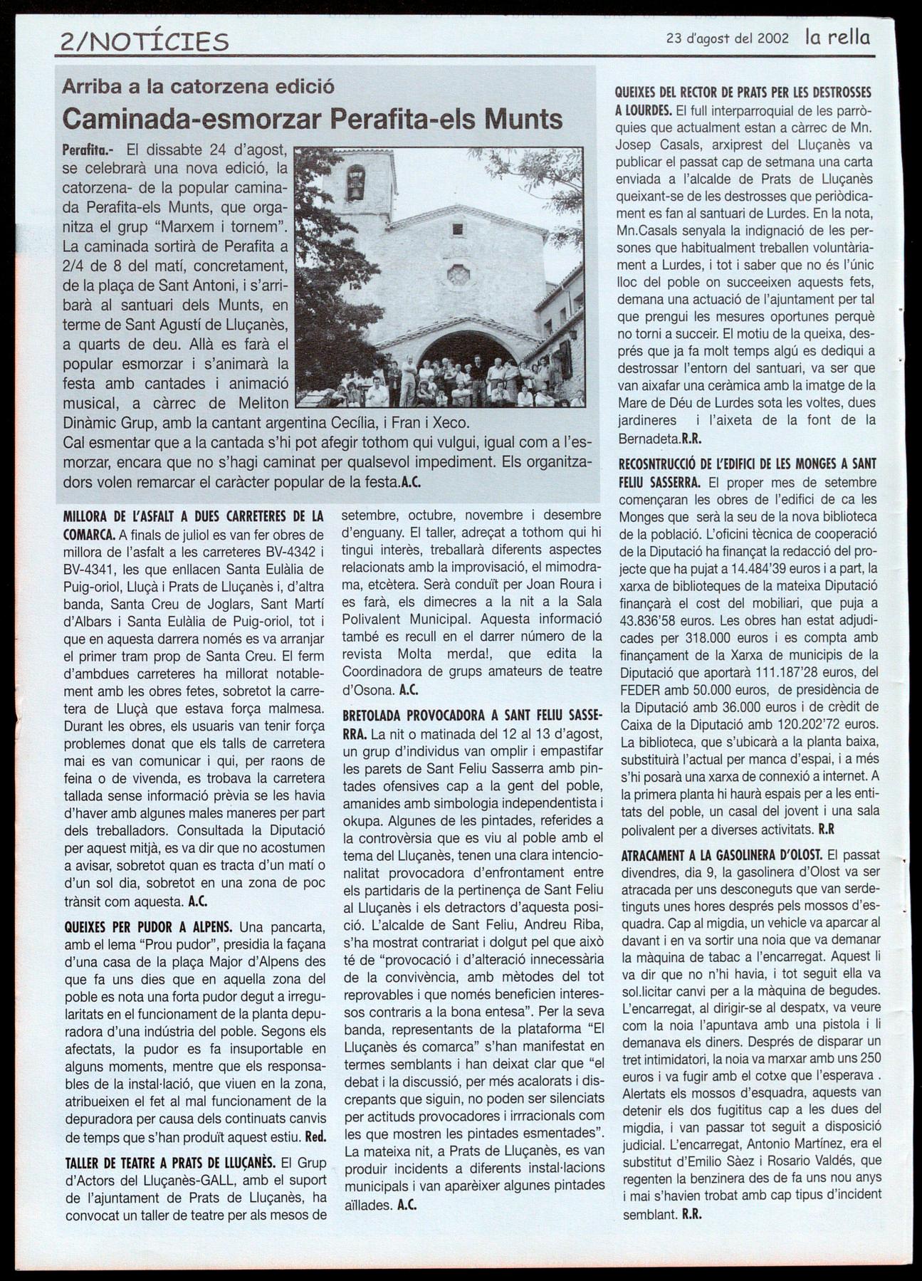 BRETOLADA PROVOCADORA A SANT FELIU SASSERRA. La nit o matinada del 12 al 13 d'agost, un grup d'individus van omplir empastifar les parets de Sant Feliu Sasserra amb pintades ofensives cap a la gent del poble, amanides amb simbologia independentista okupa. Algunes de les pintades, referides a la controvèrsia que es viu al poble amb el tema del Lluçanès, tenen una clara intencionalitat provocadora d'enfrontament entre els partidaris de la pertinença de Sant Feliu al Lluçanès i els detractors d'aquesta posició. L'alcalde de Sant Feliu, Andreu Riba, s'ha mostrat contrariat dolgut pel que això té de "provocació d'alteració innecessària de la convivència, amb mètodes del tot reprovables que només beneficien interessos contraris a la bona entesa". Per la seva banda, representants de la plataforma "El Lluçanès és comarca" s'han manifestat en termes semblants i han deixat clar que "el debat la discussió, per més acalorats discrepants que siguin, no poden ser silenciats per actituds provocadores irrracionals com les que mostren les pintades esmentades". La mateixa nit, a Prats de Lluçanès, es van produir incidents a diferents instal·lacions municipals i van aparèixer algunes pintades aïllades. A.C.