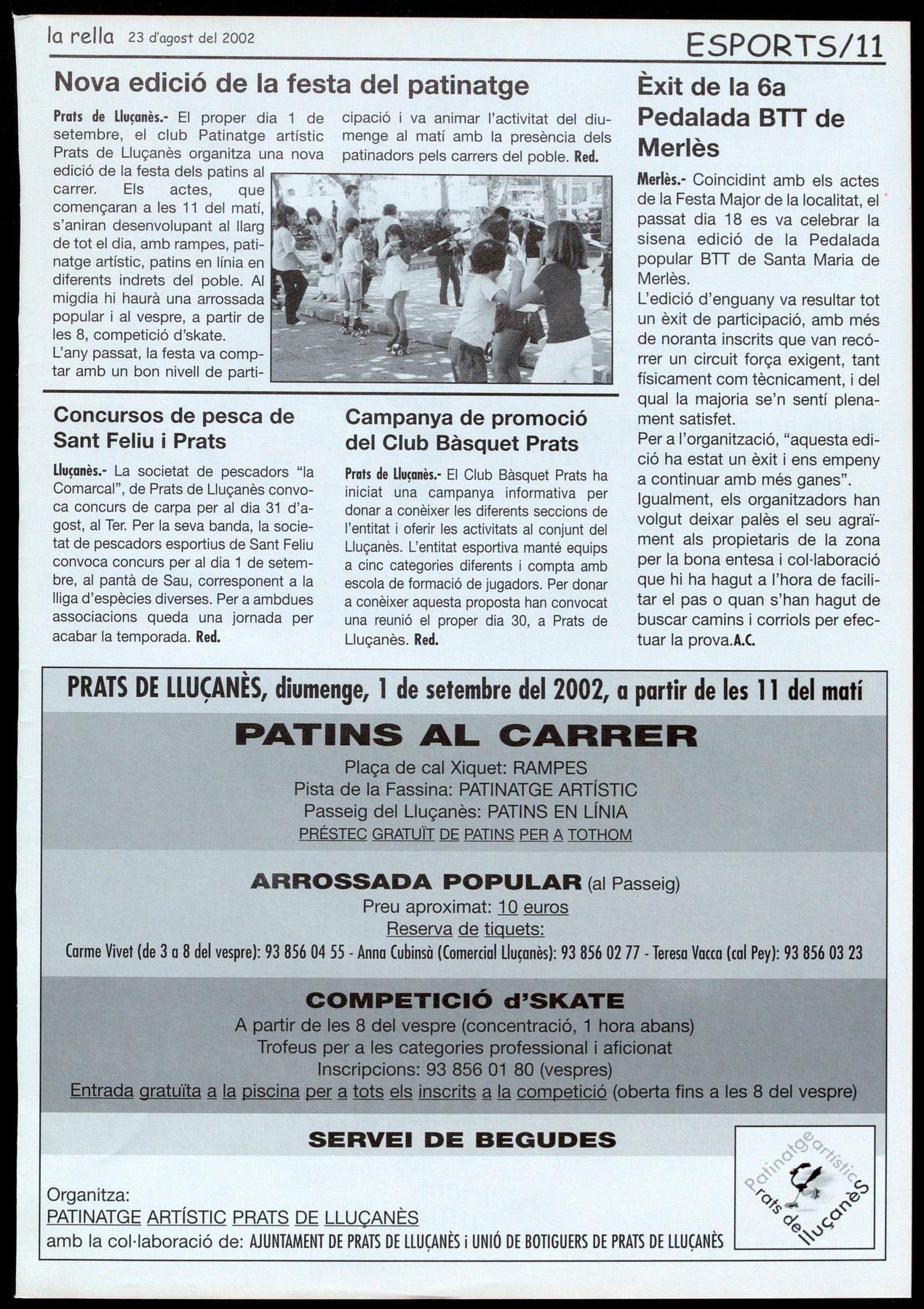 Prats de Lluçanès.- El proper dia 1 de cipació va animar l'activitat del diusetembre, el club Patinatge artístic menge al matí amb la presència dels Prats de Lluçanès organitza una nova patinadors pels carrers del poble. Red. edició de la festa dels patins al ne-----...,.--.--,,,..---....,..,---..,-,.....-carrer. Els actes, que començaran a les 11 del matí, s'aniran desenvolupant al llarg de tot el dia, amb rampes, patinatge artístic, patins en línia en diferents indrets del poble. AI migdia hi haurà una arrossada