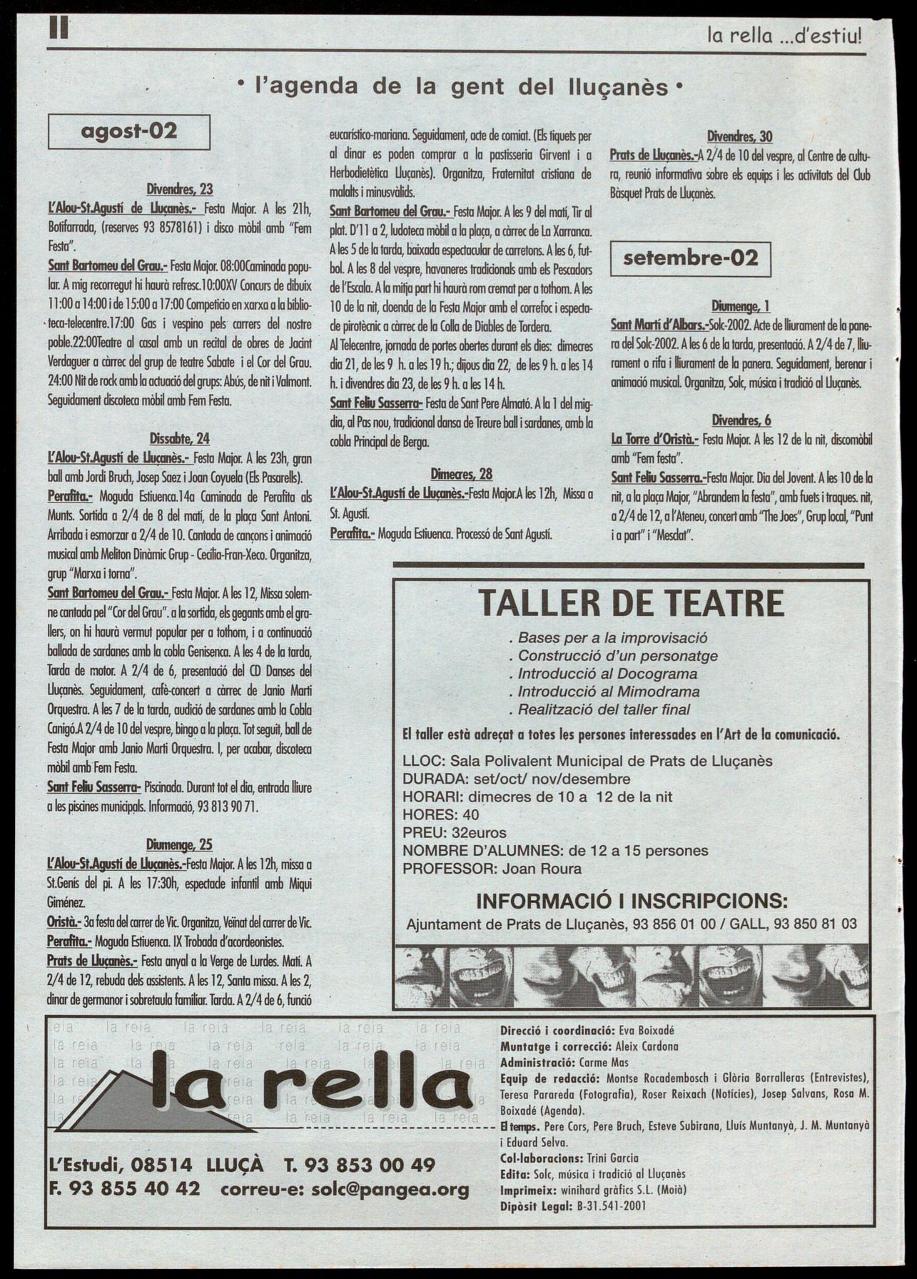 setembre, octubre, novembre desembre d'enguany. El taller, adreçat a tothom qui hi tingui interès, treballarà diferents aspectes relacionats amb la improvisació, el mimodrama, etcètera. Serà conduït per Joan Roura es farà, els dimecres a la nit a la Sala Polivalent Municipal. Aquesta informació també es recull en el darrer número de la revista Molta merda!, que edita la Coordinadora de grups amateurs de teatre d'Osona. A.C.