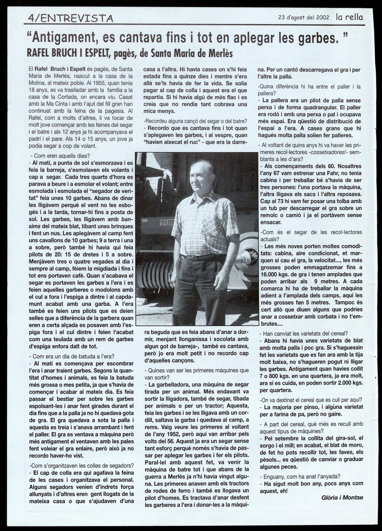 El Rafel Bruch i Espelt és pagès, de Santa Maria de Merlès, nascut a la casa de la Molina, al mateix poble. AI 1955, quan tenia 18 anys, es va traslladar amb la família a la casa de la Cortada, on encara viu. Casat amb la Ma Cinta amb l'ajut del fill gran han continuat amb la feina de la pagesia. AI Rafel, com a molts d'altres, li va tocar de molt jove començar amb les feines del segar el batre i als 12 anys ja hi acompanyava el padrí el pare. Als 14 o 15 anys, un jove ja podia segar a cop de volant.