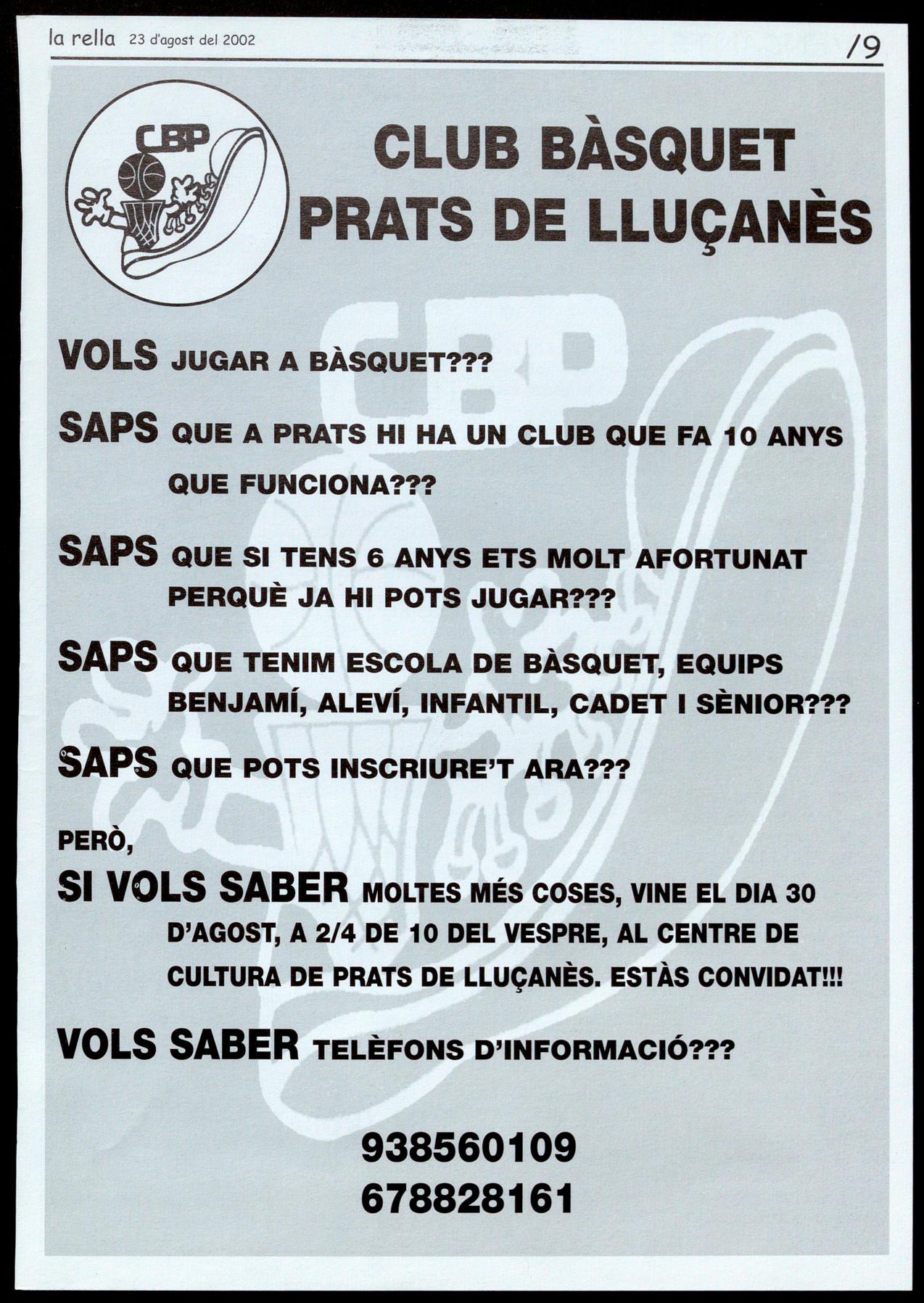 Prats de Lluçanès.- El Club Bàsquet Prats ha iniciat una campanya informativa per donar a conèixer les diferents seccions de l'entitat oferir les activitats al conjunt del Lluçanès. L'entitat esportiva manté equips a cinc categories diferents compta amb escola de formació de jugadors. Per donar a conèixer aquesta proposta han convocat una reunió el proper dia 30, a Prats de Lluçanès. Red.