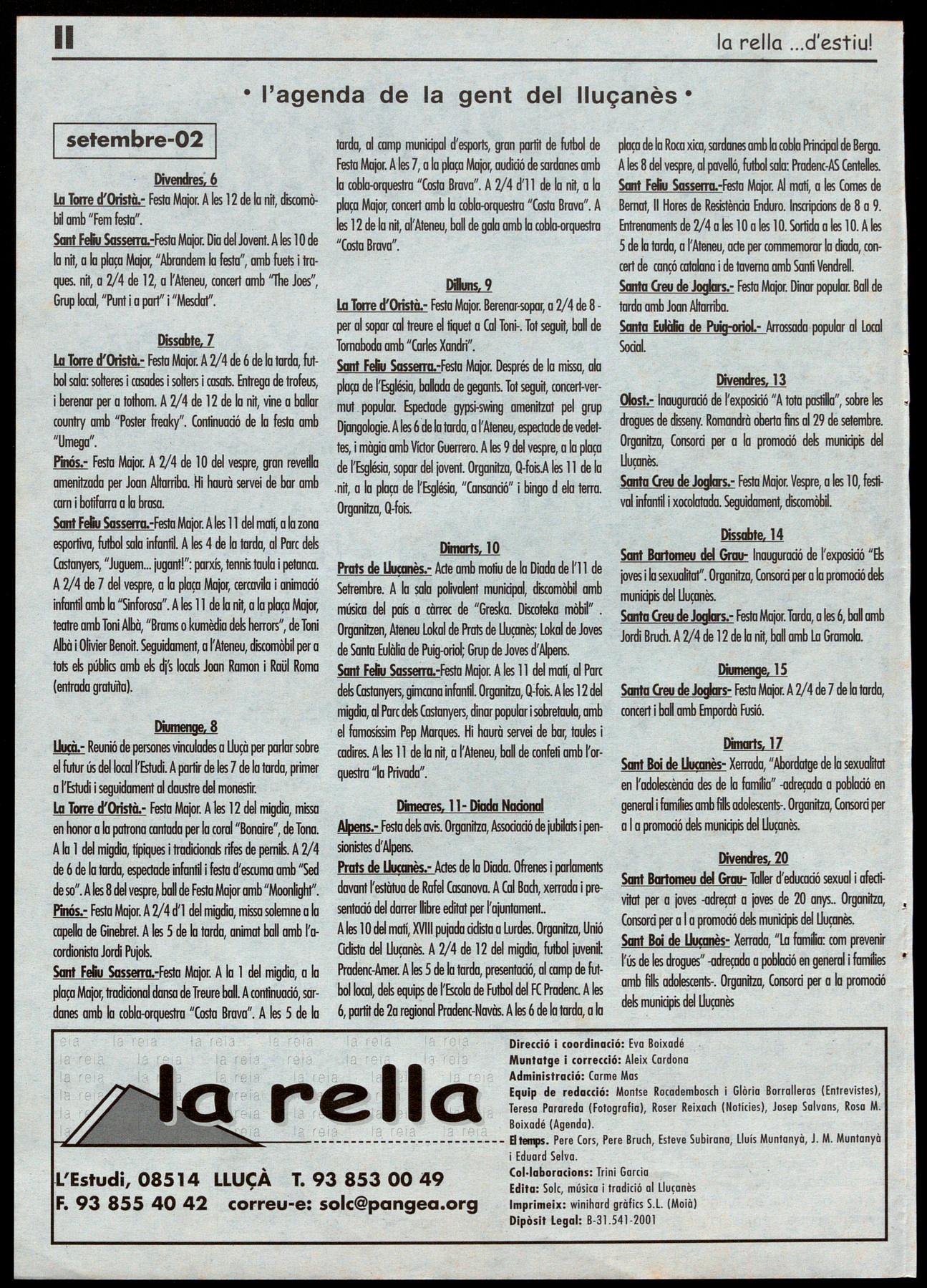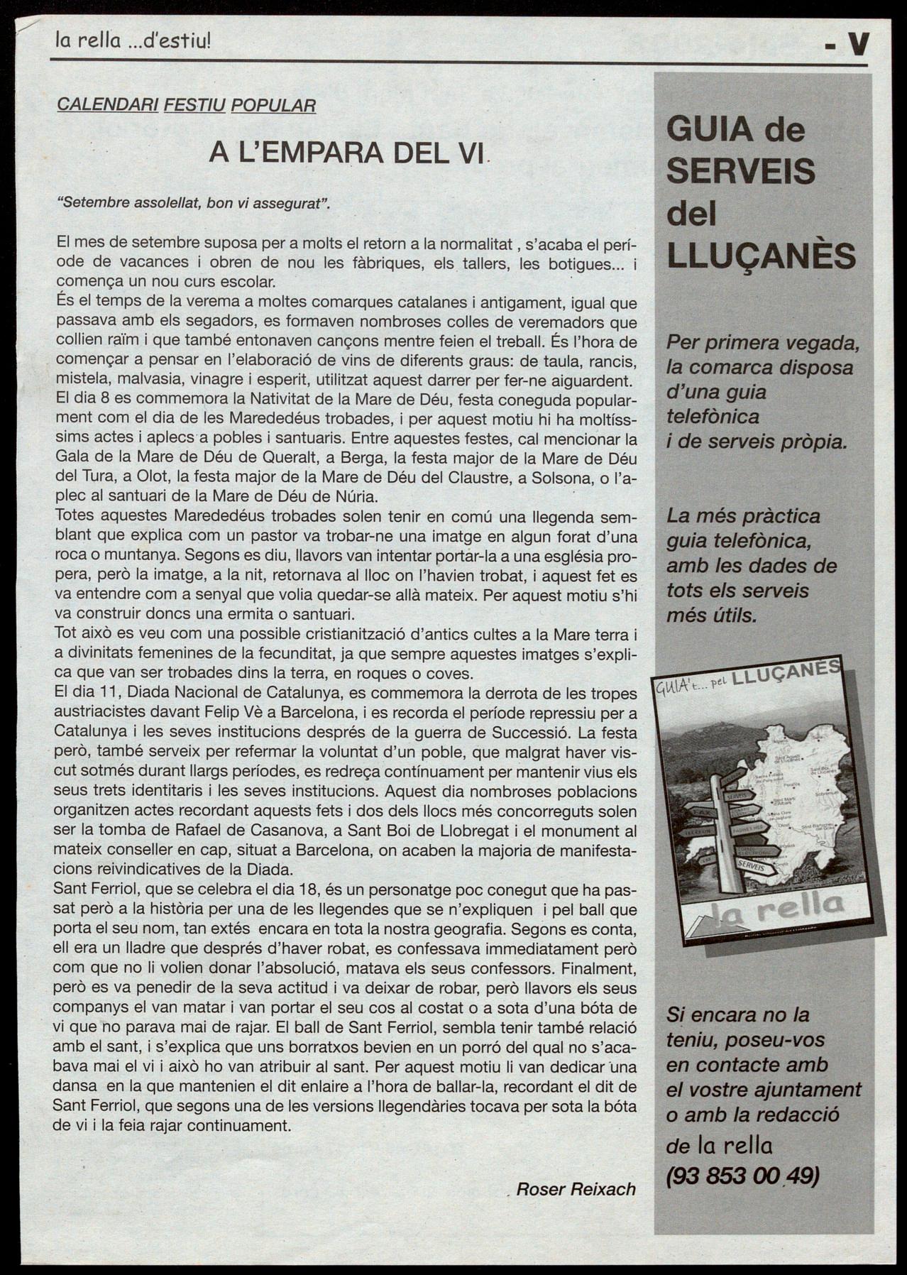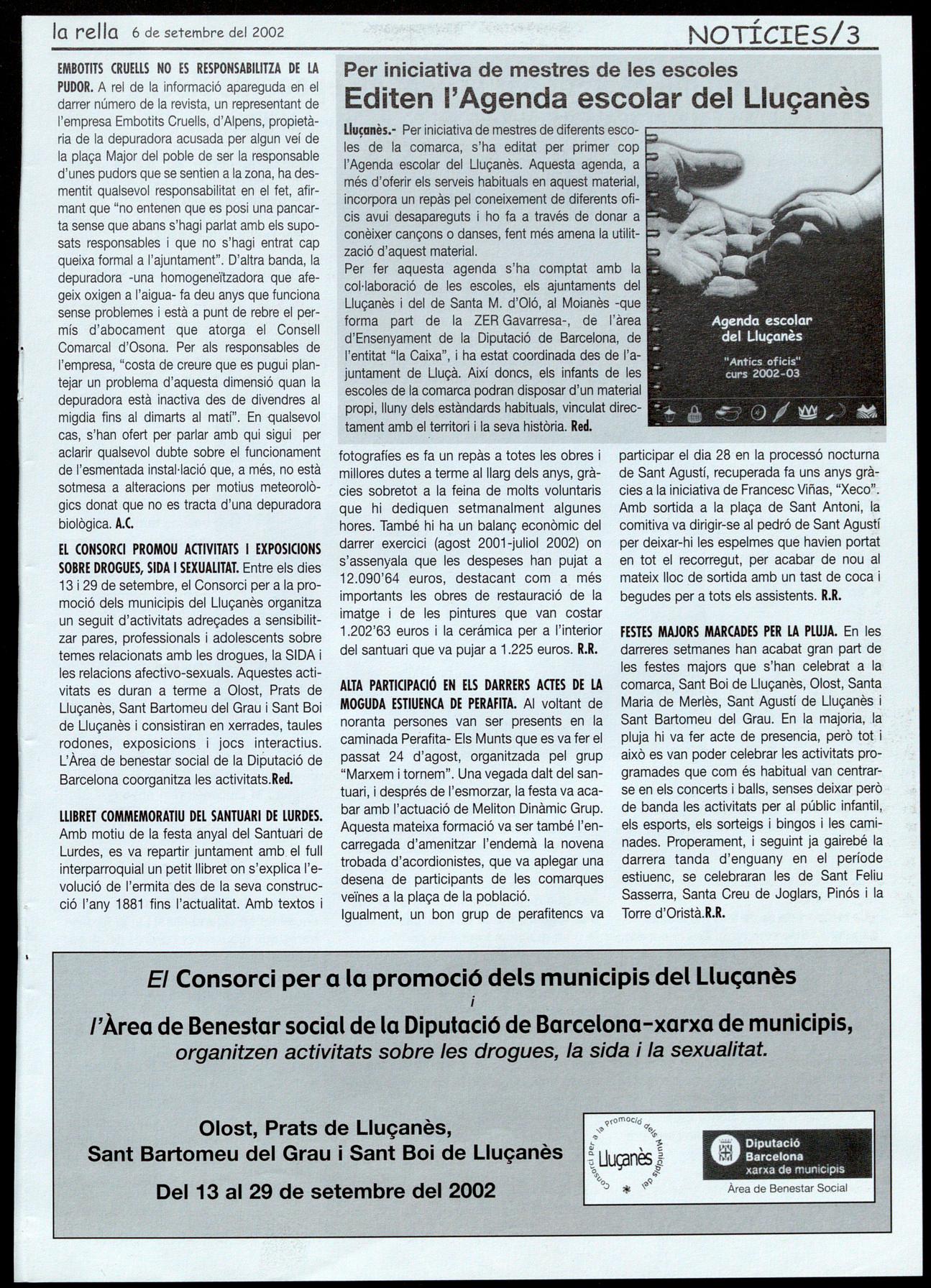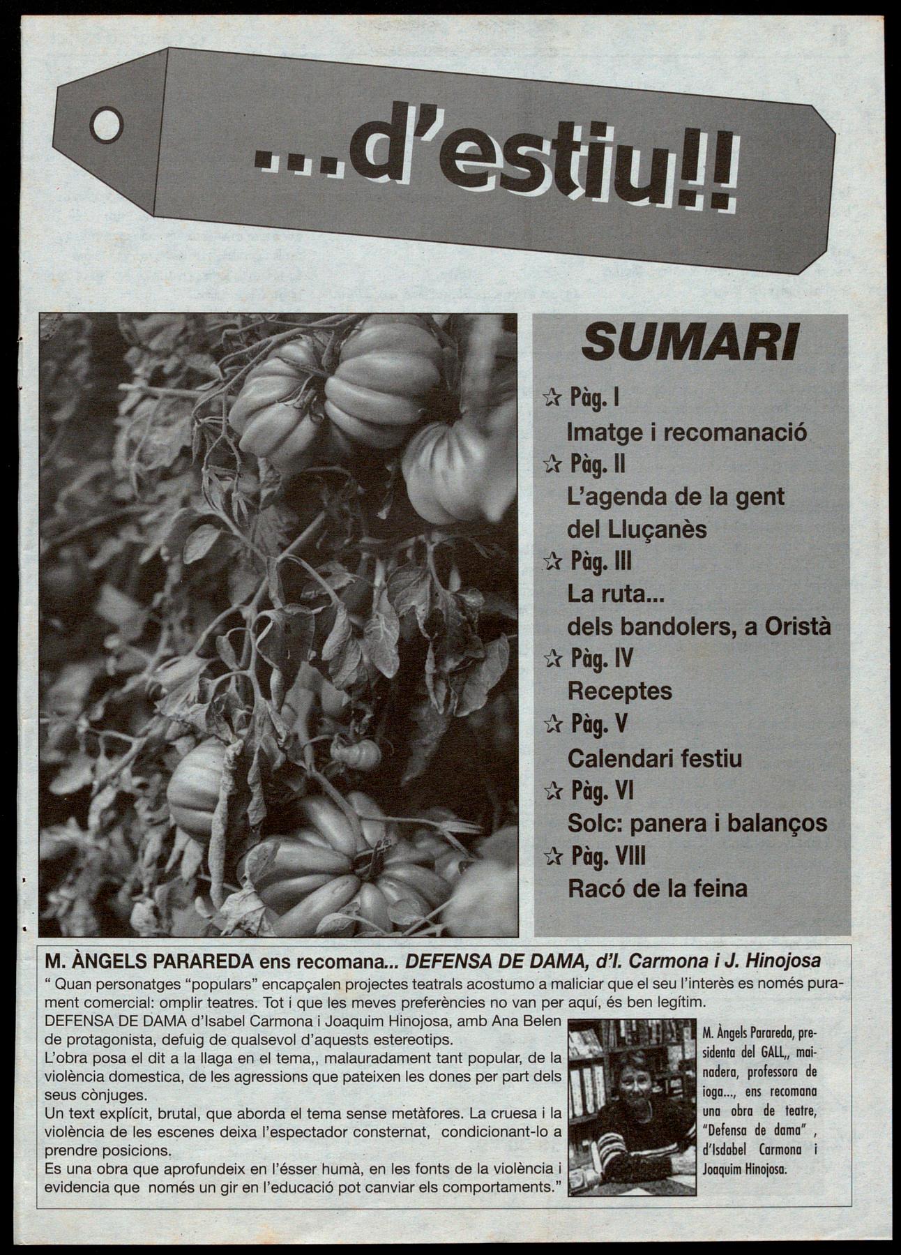 EL llUÇANÈS Al 9 NOU. Des de fa un parell de mesos, el bisetmanari El 9 Nou, d'Osona i el Ripollès, edita un suplement dedicat a la nostra comarca, amb informacions que habitualment no tenen cabuda en les edicions generals de l'esmentat periòdic. Aquest suplement, redactat per la col·laboradora del 9 Nou, Anna Gorchs, de Prats de Lluçanès, surt ordinàriament un dilluns de cada mes ve a ser una demostració de la vitalitat que actualment es viu a la comarca. Ja fa molts anys que el bisetmanari osonenc tenia propostes per tirar endavant un suplement d'aquest tipus però mai havien vist clara la possibilitat, sobretot des d'un punt de vista econòmic. R.R.