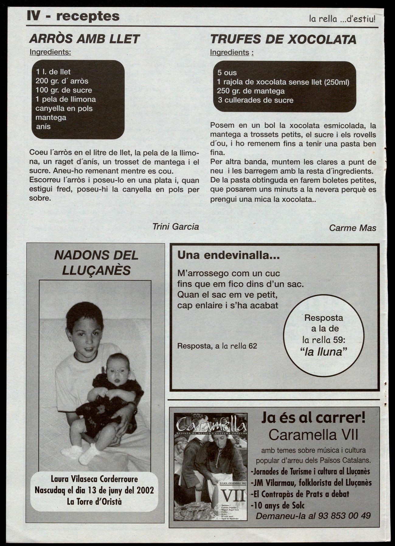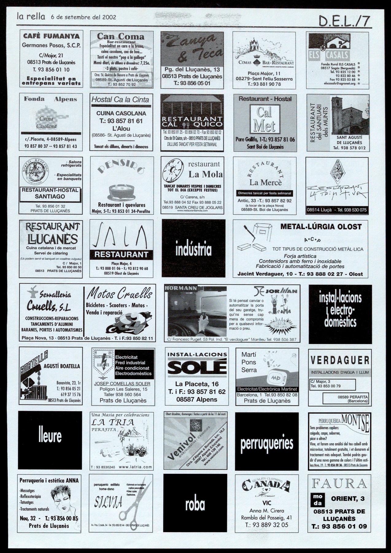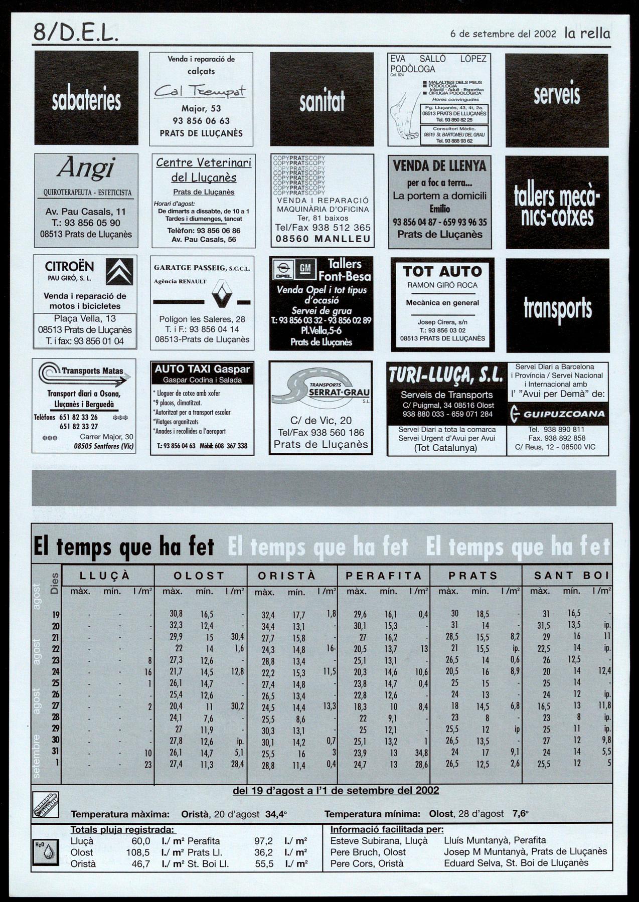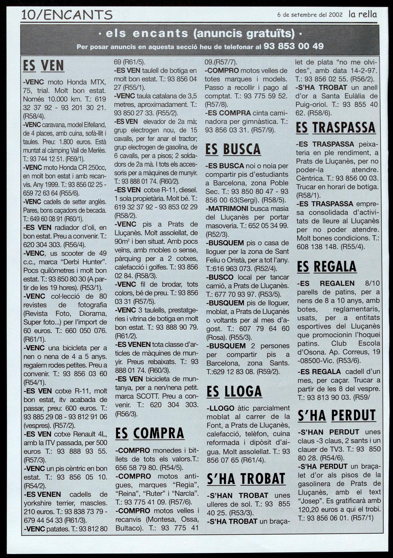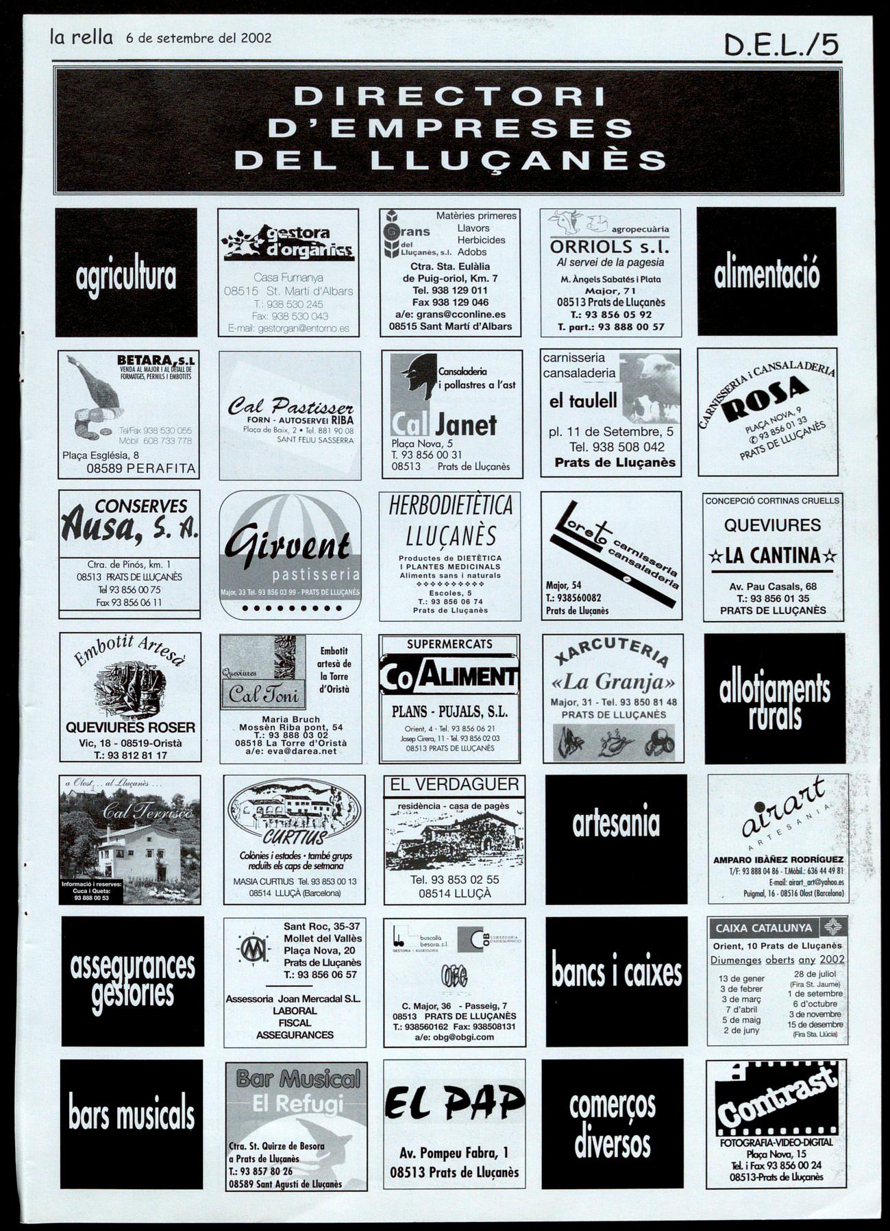 EL llUÇANÈS Al 9 NOU. Des de fa un parell de mesos, el bisetmanari El 9 Nou, d'Osona i el Ripollès, edita un suplement dedicat a la nostra comarca, amb informacions que habitualment no tenen cabuda en les edicions generals de l'esmentat periòdic. Aquest suplement, redactat per la col·laboradora del 9 Nou, Anna Gorchs, de Prats de Lluçanès, surt ordinàriament un dilluns de cada mes ve a ser una demostració de la vitalitat que actualment es viu a la comarca. Ja fa molts anys que el bisetmanari osonenc tenia propostes per tirar endavant un suplement d'aquest tipus però mai havien vist clara la possibilitat, sobretot des d'un punt de vista econòmic. R.R.