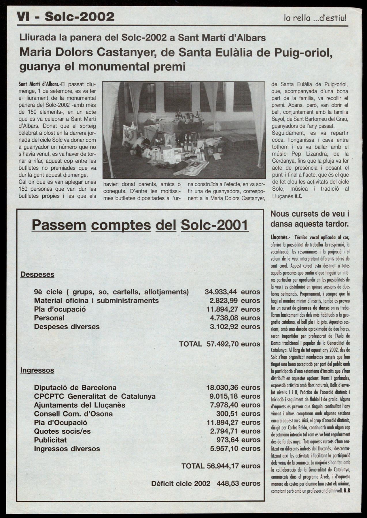 fotografíes es fa un repàs a totes les obres i millores dutes a terme aillarg dels anys, gràcies sobretot a la feina de molts voluntaris que hi dediquen setmanalment algunes hores. També hi ha un balanç econòmic del darrer exercici (agost 2001-juliol 2002) on s'assenyala que les despeses han pujat a 12.090'64 euros, destacant com a més importants les obres de restauració de la imatge de les pintures que van costar 1.202'63 euros la cerámica per a l'interior del santuari que va pujar a 1.225 euros. R.R.