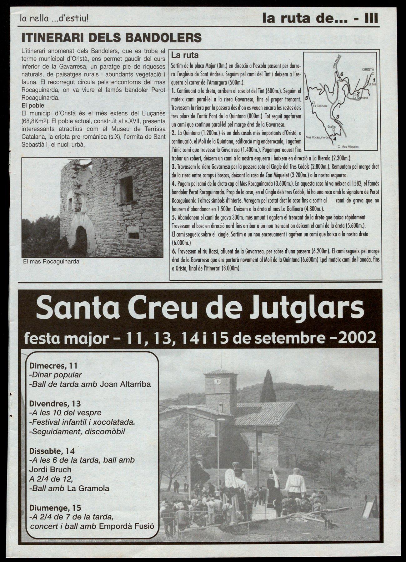 La TOfTe d'Oristà.- Festa Major. A 2/4de 6 de latarda, futbol sala: sakeres i casades i sokers i casats. Entrega de trofeus, i berenar per a tothom. A 2/4 de 12 de la n�,'vine a ballar country amb "Poster frOOky". Continuació de la festa amb "Umega".