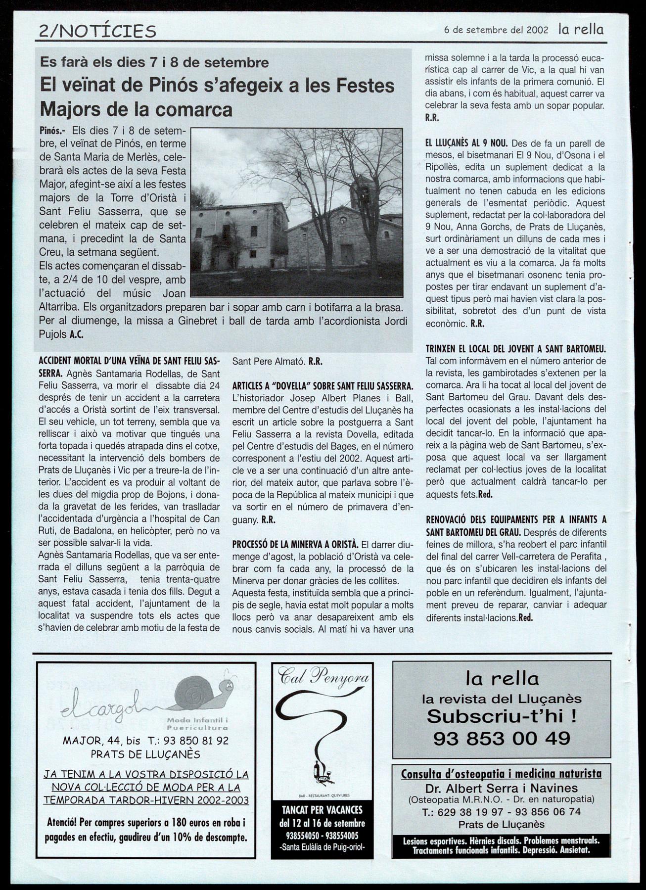 Pinós.- Els dies 7 8 de setem- ,-------,.____",,,,,,,.......,.,.,.. bre, el veïnat de Pinós, en terme de Santa Maria de Merlès, celebrarà els actes de la seva Festa Major, afegint-se així a les festes majors de la Torre d'Oristà i Sant Feliu Sasserra, que se celebren el mateix cap de setmana, precedint la de Santa Creu, la setmana següent. Els actes començaran el dissabte, a 2/4 de 10 del vespre, amb l'actuació del music Joan Altarriba. Els organitzadors preparen bar i sopar amb carn i botifarra a la brasa. Per al diumenge, la missa a Ginebret i ball de tarda amb l'acordionista Jordi Pujols A.C.