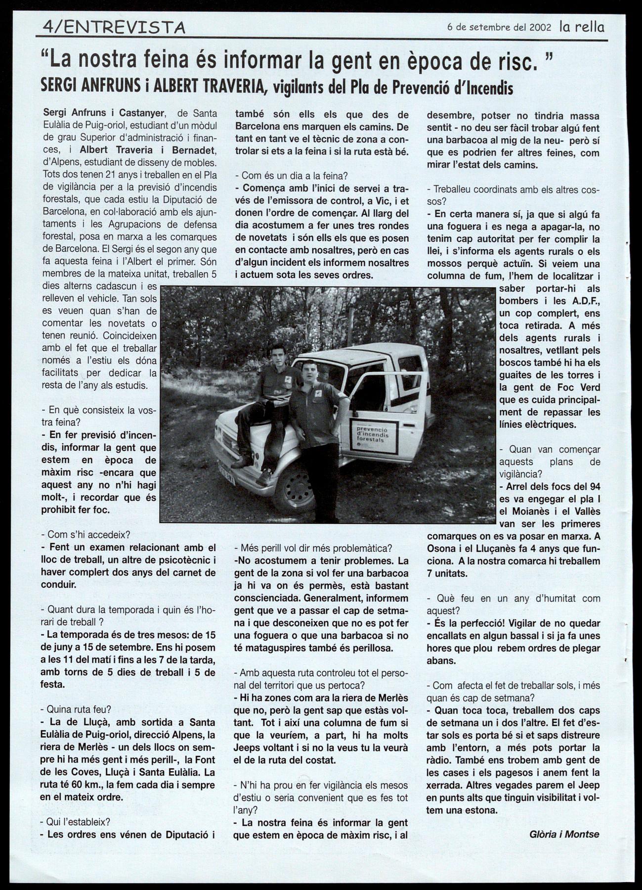 Sergi Anfruns i Castanyer, de Santa Eulàlia de Puig-oriol, estudiant d'un mòdul de grau Superior d'administració finances, Albert Traveria i Bernadet, d'Alpens, estudiant de disseny de mobles. Tots dos tenen 21 anys treballen en el Pla de vigilància per a la previsió d'incendis forestals, que cada estiu la Diputació de Barcelona, en col-laboració amb els ajuntaments les Agrupacions de defensa forestal, posa en marxa a les comarques de Barcelona. El Sergi és el segon any que fa aquesta feina i l'Albert el primer. Són membres de la mateixa unitat, treballen 5 dies alterns cadascun es relleven el vehicle. Tan sols es veuen quan s'han de comentar les novetats o tenen reunió. Coincideixen amb el fet que el treballar només a l'estiu els dóna facilitats �per dedicar la resta de l'anyals estudis.