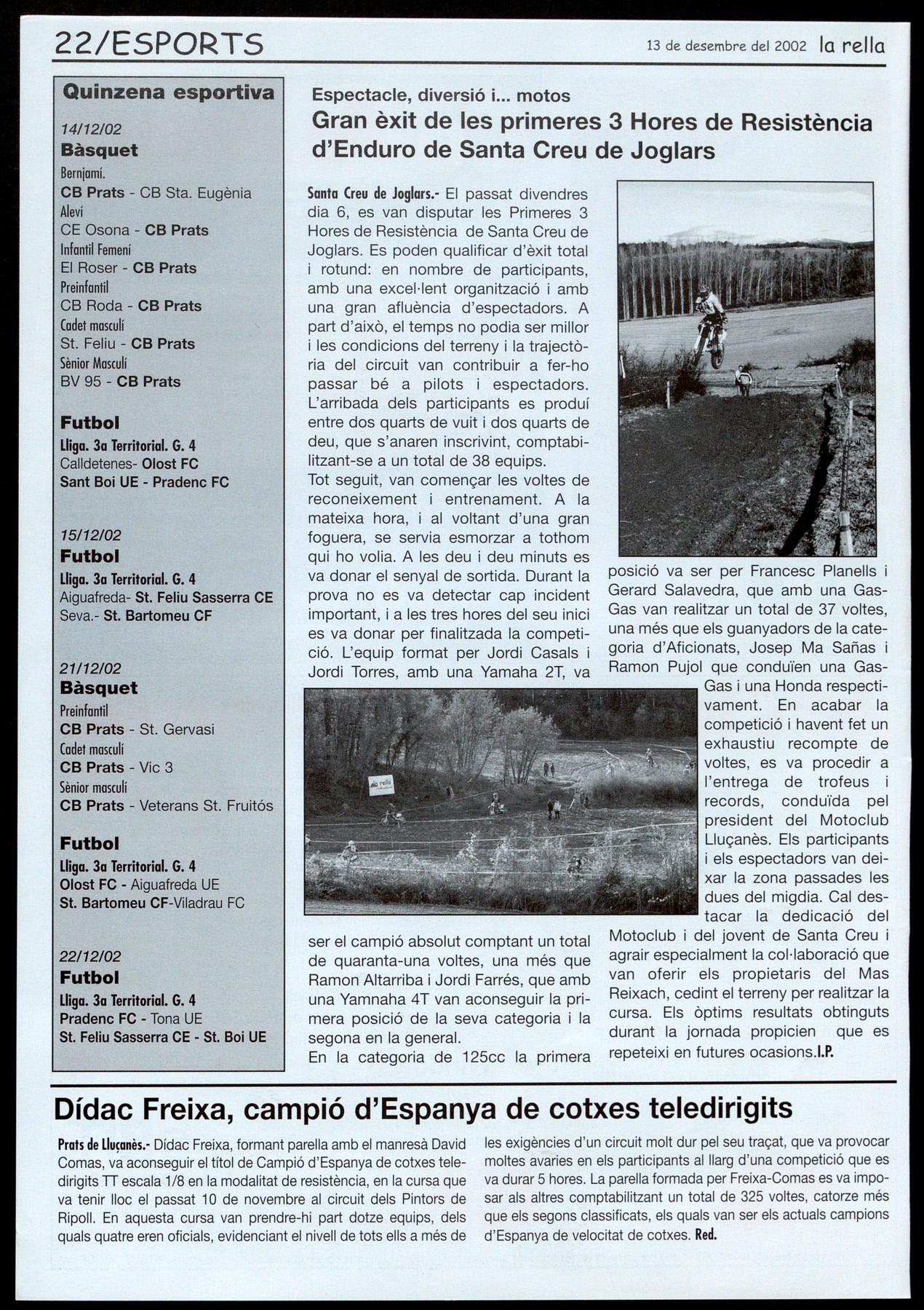Prats de Lluçanès.- Dídac Freixa, formant parella amb el manresà David Comas, va aconseguir el títol de Campió d'Espanya de cotxes teledirigits TI escala 1/8 en la modalitat de resistència, en la cursa que va tenir lloc el passat 10 de novembre al circuit dels Pintors de Ripoll. En aquesta cursa van prendre-hi part dotze equips, dels quals quatre eren oficials, evidenciant el nivell de tots ells a més de les exigències d'un circuit molt dur pel seu traçat, que va provocar moltes avaries en els participants al llarg d'una competició que es va durar 5 hores. La parella formada per Freixa-Comas es va imposar als altres comptabilitzant un total de 325 voltes, catorze més que els segons classificats, els quals van ser els actuals campions d'Espanya de velocitat de cotxes. Red.