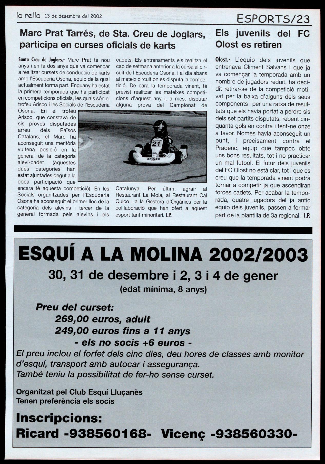 Olost." L'equip dels juvenils que entrenava Climent Salvans que ja va començar la temporada amb un nombre de jugadors reduït, ha decidit retirar-se de la competició motivat per la baixa d'alguns dels seus components i per una ratxa de resultats que els havia portat a perdre sis dels set partits disputats, rebent cinquanta gols en contra fent-ne onze a favor. Només havia aconseguit un punt, precisament contra el Pradenc, equip que tampoc obté uns bons resultats, tot no practicar un mal futbol. El futur dels juvenils del FC Olost no està clar, tot que es creu que la temporada vinent podrà tornar a competir ja que ascendiran forces cadets. Per acabar la temporada, quatre jugadors del ja antic equip dels juvenils, passen a formar part de la plantilla de 3a regional. I.P.