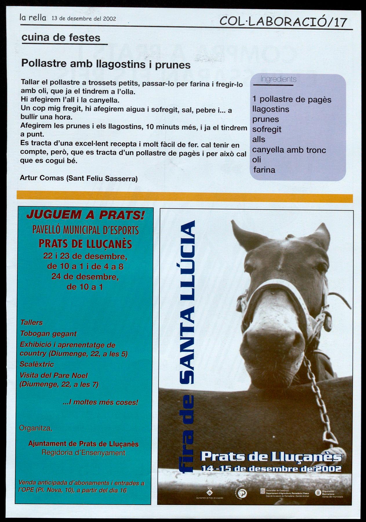 Prats de Uucanès. - RradeSanta Uúcia. Mer(atsetmanal, exposició de maquinària, de bestiar. Expasició fira de rucs. De 8 a 11, esmorzar popular; de2/4de 12 a 14,passejadaamb carros rucs per a lamainada. Festa delbosc. X Concursdetilla d'arbres, ròssec de troncs d'exhibició, concurs de destral. Exhihició i cursa d'automodelisme. A les 2 del migdia al Pavelló, arrossada popular. Prats de Uucanès.- XVII Nadal al (arrer. Representació de quadres nadalencs a (àrrec dels alumnes del col·legi Presentació de la MaredeDéu, apartirdeles 6 delatarda.