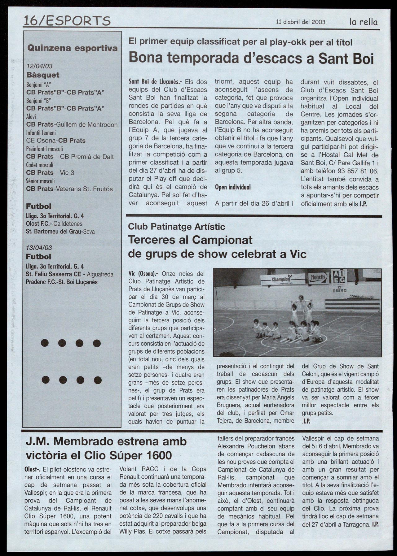 Vic (Osona).- Onze noies del Club Patinatge Artístic de Prats de Lluçanès van partielpar el dia 30 de març al Campionat de Grups de Shaw de Patinatge a Vic, aconseguint la tercera posició dels diferents grups que participaven al certamen. Aquest concurs consistia en l'actuació de grups de diferents poblacions (en total nou, cinc dels quals eren petits -de menys de setze persones- quatre eren grans -més de setze perosnes-, el grup de Prats era petit) presentaven un espectacle que posteriorment era valorat per tres jutges, els quals havien de puntuar la