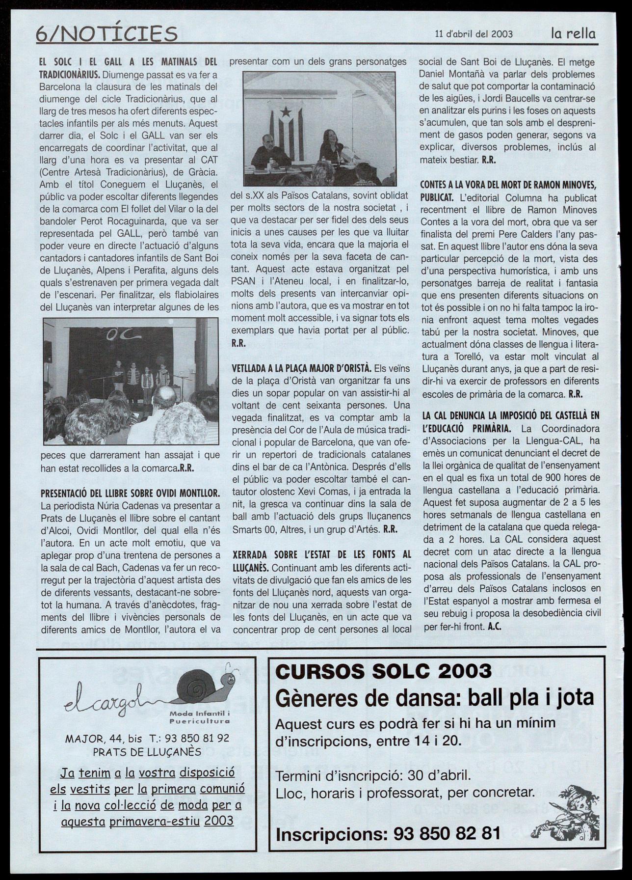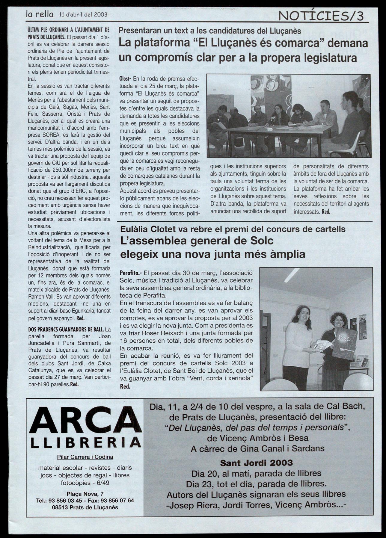 En acabar la reunió, es va fer lliurament del premi del concurs de cartells Solc 2003 a l'Eulàlia Clotet, de Sant Boi de Lluçanès, que el va guanyar amb l'obra "Vent, corda xerinola" Red.