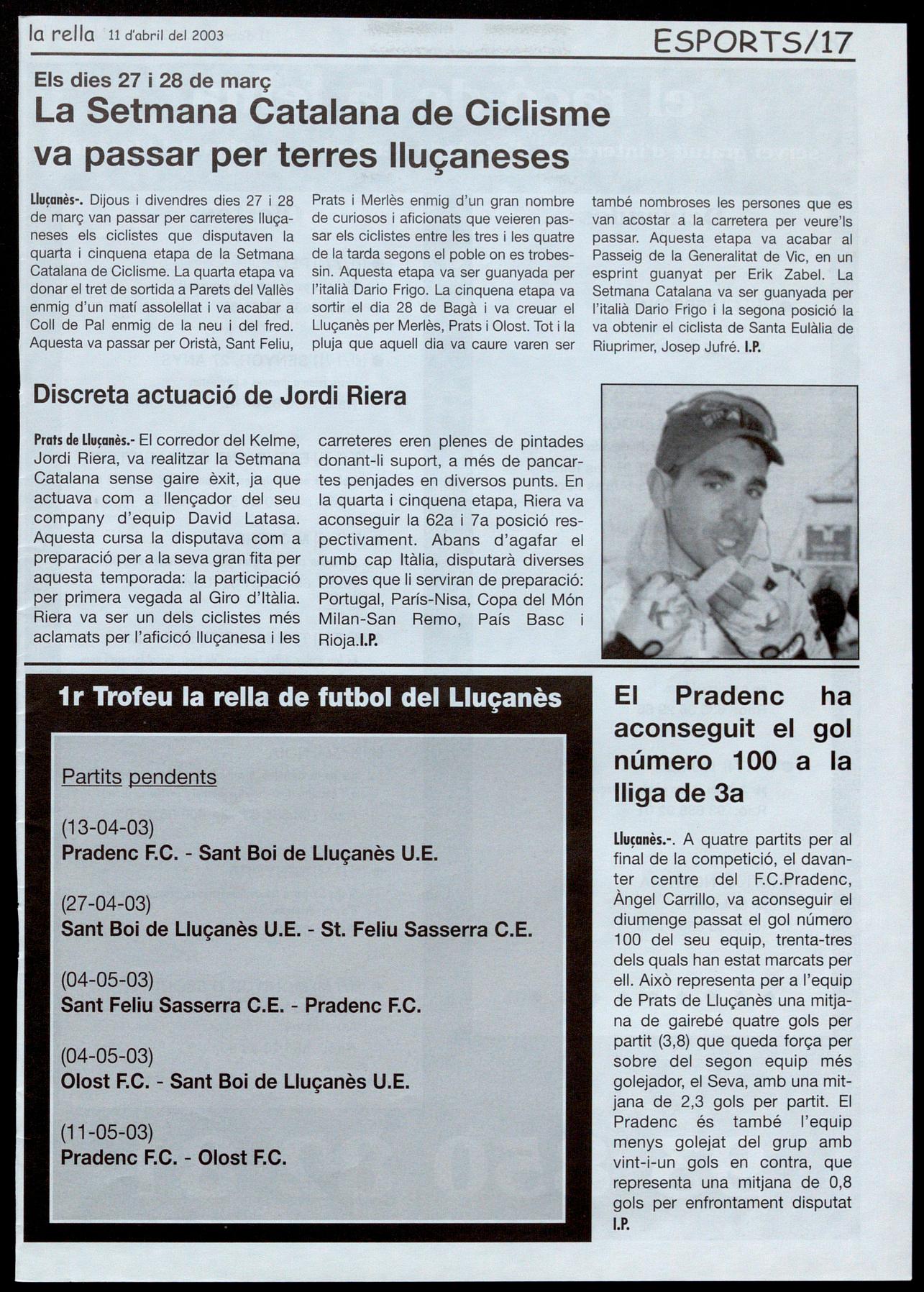 Prats de Lluçanès.- El corredor del Kelme, Jordi Riera, va realitzar la Setmana Catalana sense gaire èxit, ja que actuava com a lIençador del seu company d'equip David Latasa. Aquesta cursa la disputava com a preparació per a la seva gran fita per aquesta temporada: la participació per primera vegada al Giro d'Itàlia.