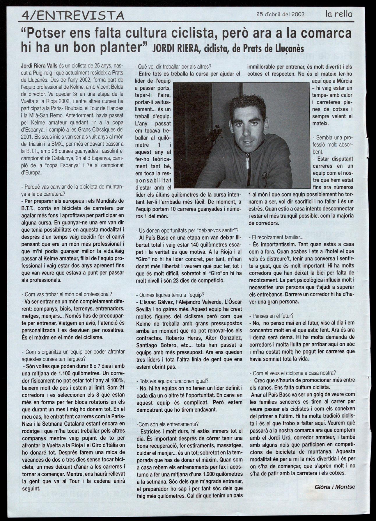 Jordi Riera Valls és un ciclista de 25 anys, nascut a Puig-reig que actualment resideix a Prats de Lluçanès. Des de l'any 2002, forma part de l'equip professional de Kelme, amb Vicent Belda de director. Va quedar 3r en una etapa de la Vuelta a la Rioja 2002, entre altres curses ha participat a la París- Roubaix, el Tour de Flandes la Milà-San Remo. Anteriorment, havia passat pel Kelme amateur quedant 1 r a la copa d'Espanya, campió a les Grans Clàssiques del 2001. Els seus inicis van ser als vuit anys al món del trialsín la BMX., per més endavant passar a la B.n., amb 28 curses guanyades i assolint el campionat de Catalunya, 2n al d'Espanya, campió de la "copa Espanya" lè al campionat d'Europa.