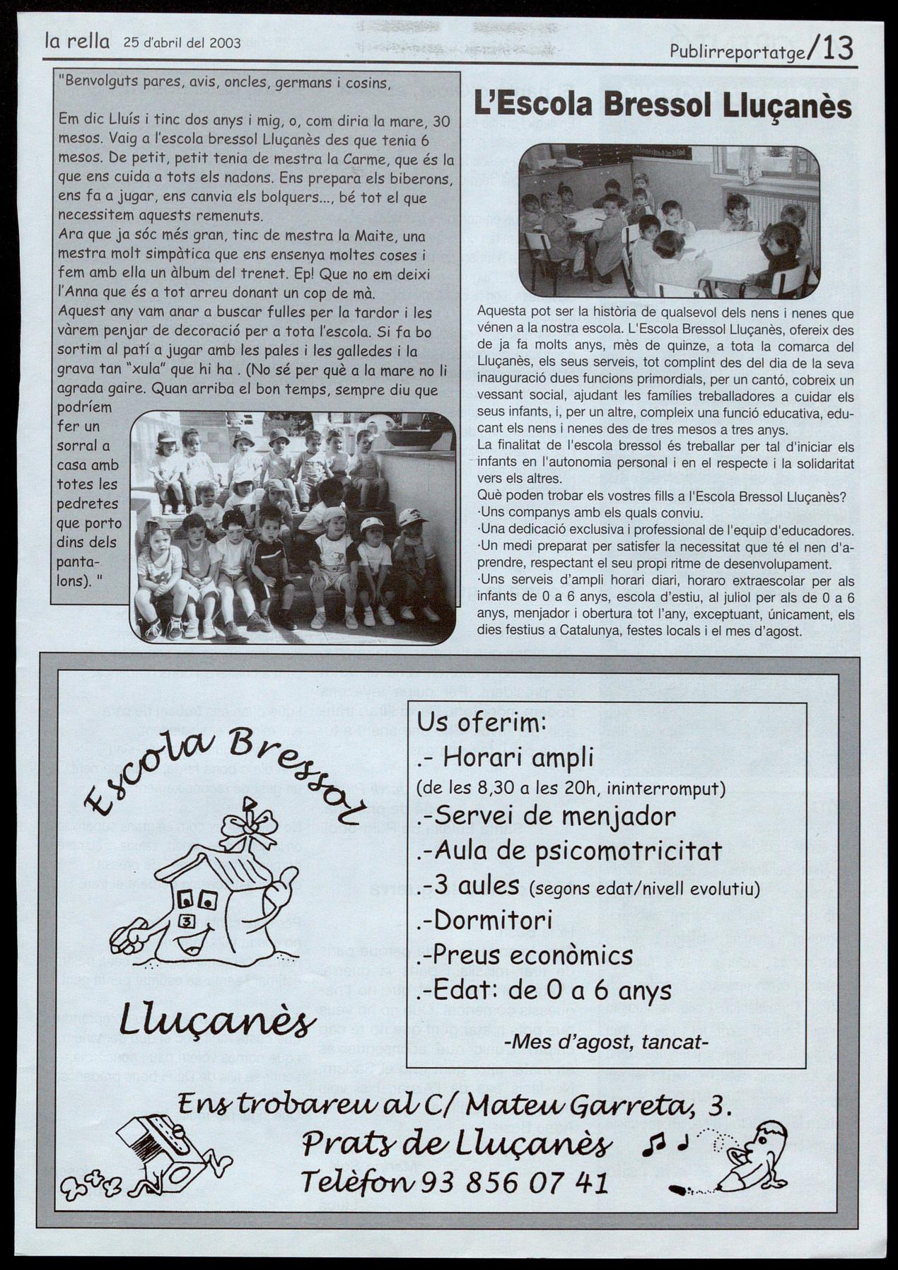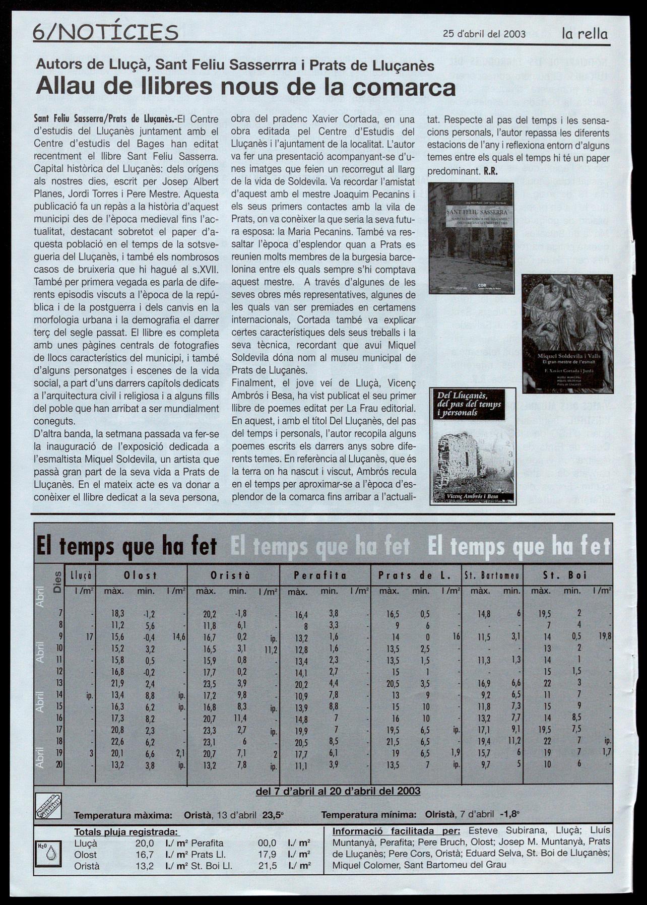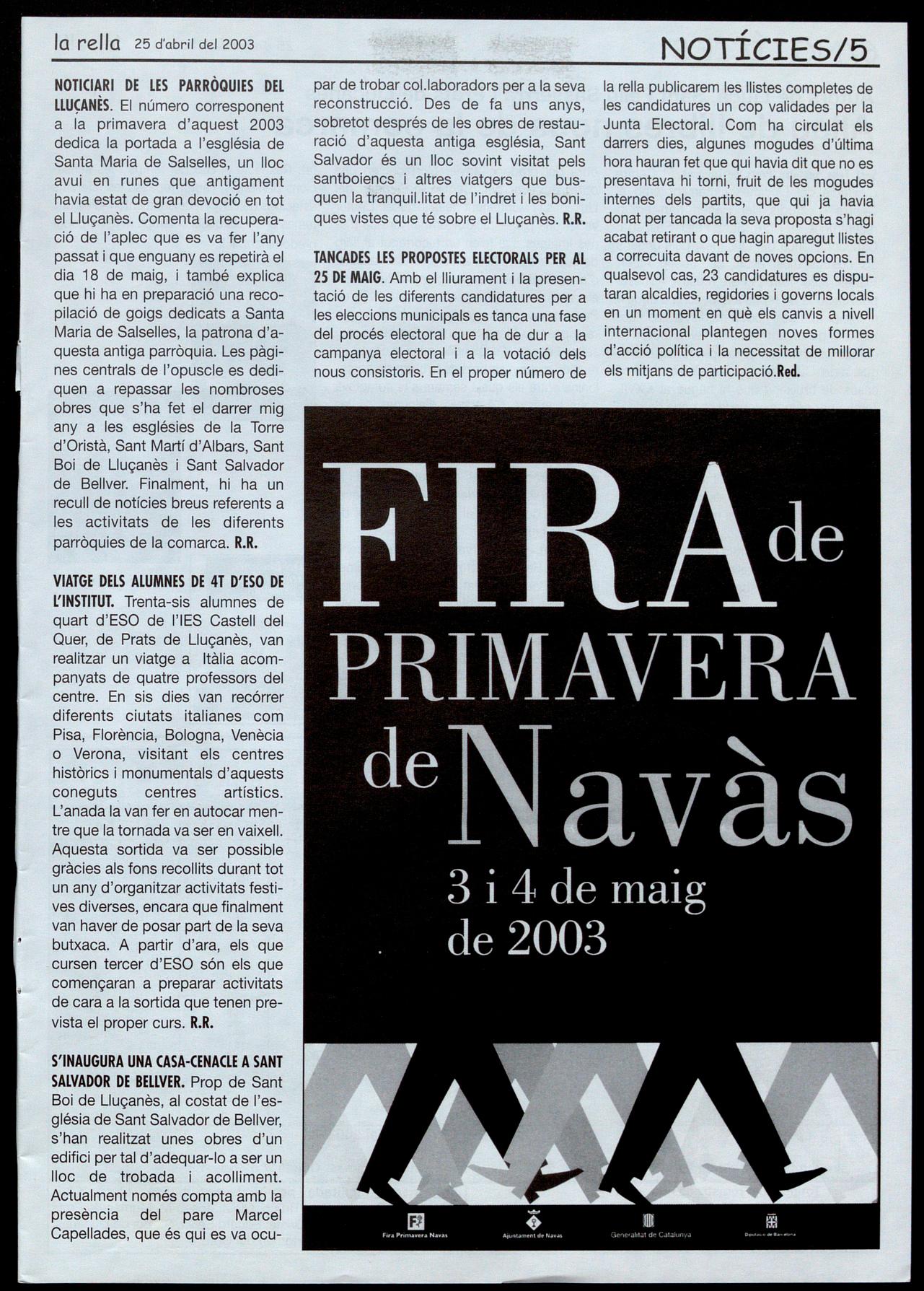 NOTICIARI DE LES PARRÒQUIES DEL LLUÇANÈS. El número corresponent a la primavera d'aquest 2003 dedica la portada a l'església de Santa Maria de Salselles, un lloc avui en runes que antigament havia estat de gran devoció en tot el Lluçanès. Comenta la recuperació de l'aplec que es va fer l'any passat que enguany es repetirà el dia 18 de maig, també explica que hi ha en preparació una recopilació de goigs dedicats a Santa Maria de Salselles, la patrona d'aquesta antiga parròquia. Les pàgines centrals de l'opuscle es dediquen a repassar les nombroses obres que s'ha fet el darrer mig any a les esglésies de la Torre d'Oristà, Sant Martí d'Albars, Sant Boi de Lluçanès Sant Salvador de Bellver. Finalment, hi ha un recull de notícies breus referents a les activitats de les diferents parròquies de la comarca. R.R.