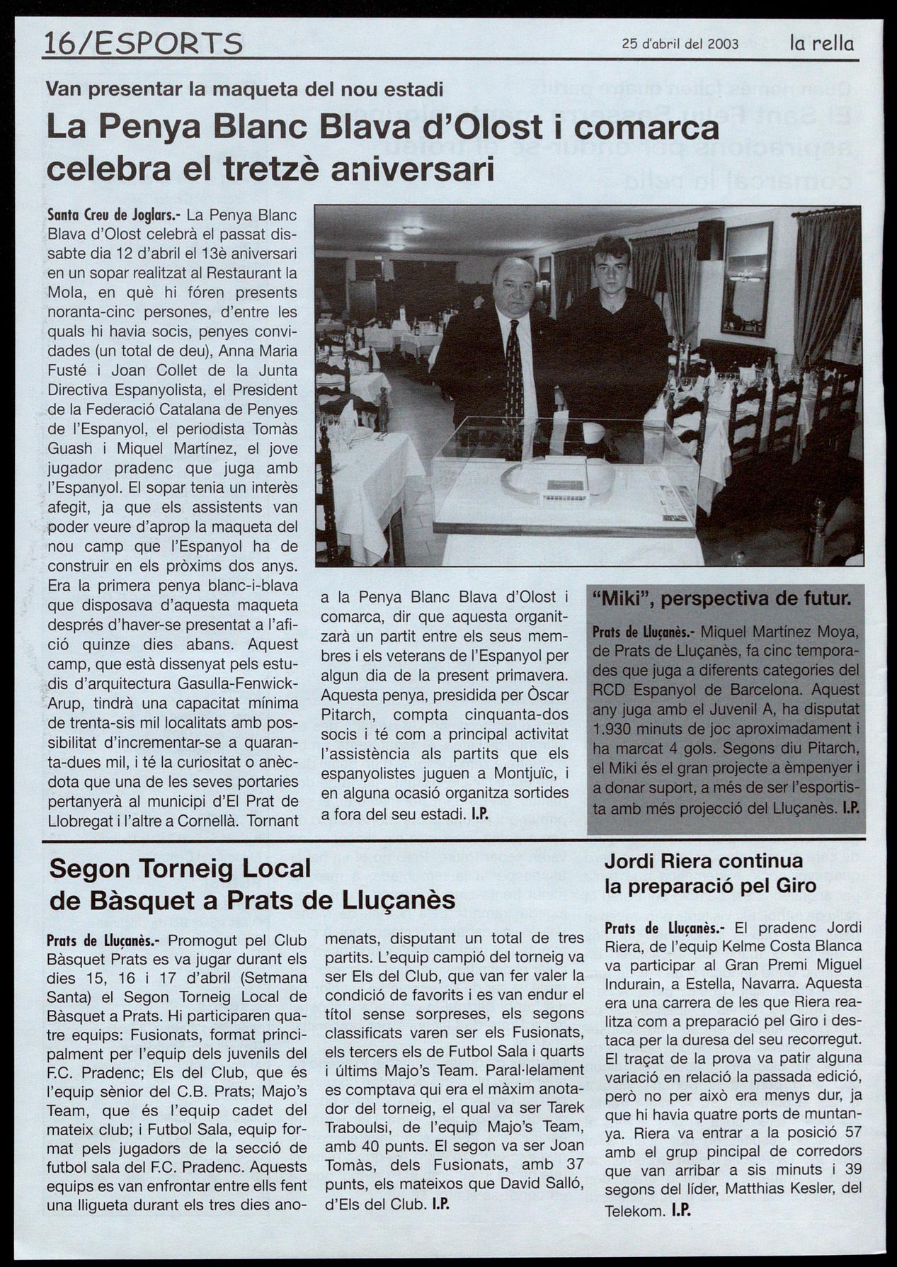 Sonia (reu de Joglars.- La Penya Blanc Blava d'Olost celebrà el passat dissabte dia 12 d'abril el13è aniversari en un sopar realitzat al Restaurant la Mola, en què hi fóren presents noranta-cinc persones, d'entre les quals hi havia socis, penyes convidades (un total de deu), Anna Maria Fusté Joan Collet de la Junta Directiva Espanyolista, el President de la Federació Catalana de Penyes de l'Espanyol, el periodista Tomàs Guash Miquel Martínez, el jove jugador pradenc que juga amb l'Espanyol. El sopar tenia un interès afegit, ja que els assistents van poder veure d'aprop la maqueta del nou camp que l'Espanyol ha de construir en els pròxims dos anys. Era la primera penya blanc-i-blava que disposava d'aquesta maqueta després d'haver-se presentat a l'afició quinze dies abans. Aquest camp, que està dissenyat pels estu.dis d'arquitectura Gasulla-Fenwick"Arup, tindrà una capacitat mínima de trenta-sis millocalitats amb possibilitat d'incrementar-se a quaranta-dues mil, i té la curiositat o anècdota que una de les seves portaries pertanyerà al municipi d'El Prat de Llobregat l'altre a Cornellà. Tornant