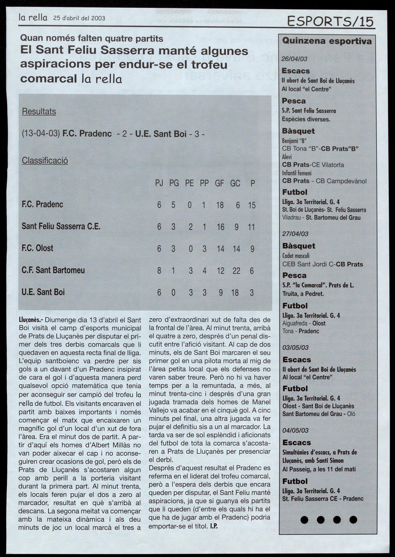Prats de Llu�anès.- Promogut pel Club menats, disputant un total de tres Bàsquet Prats es va jugar durant els partits. L'equip campió del torneig va dies 15, 16 i 17 d'abril (Setmana ser Els del Club, que van fer valer la Santa) el Segon Torneig Local de condició de favorits es van endur el Bàsquet a Prats. Hi participaren qua- títol sense sorpreses, els segons tre equips: Fusionats, format princi- classificats varen ser els Fusionats palment per l'equip dels juvenils del els tercers els de Futbol Sala quarts F.C. Pradenc; Els del Club, que és últims Majo's Team. Paral-lelament l'equip sènior del C.B. Prats; Majo's es comptava qui era el màxim anotaTeam, que és l'equip cadet del dor del torneig, el qual va ser Tarek mateix club; i Futbol Sala, equip for- Traboulsi, de l'equip Majo's Team, mat pels jugadors de la secció de amb 40 punts. El segon va ser Joan futbol sala del F.C. Pradenc. Aquests Tomàs, dels Fusionats, amb 37 equips es van enfrontar entre ells fent punts, els mateixos que David Salló, una lligueta durant els tres dies ano- d'Eis del Club. I.P.