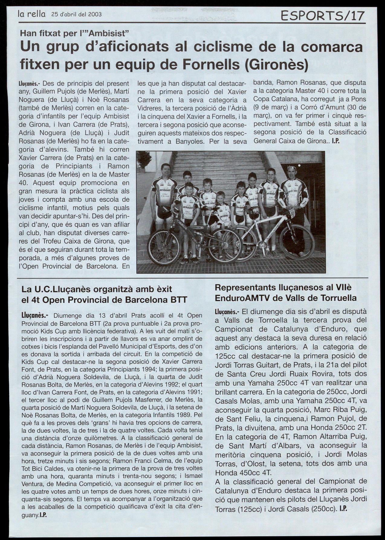 Lluçanès.- Des de principis del present any, Guillem Pujols (de Merlès), Martí Noguera (de Lluçà) Noè Rosanas (també de Merlès) corren en la categoria d'infantils per l'equip Ambisist de Girona, i Ivan Carrera (de Prats), Adrià Noguera (de Lluçà) Judit Rosanas (de Merlès) ho fa en la categoria d'alevins. També hi corren Xavier Carrera (de Prats) en la categoria de Principiants Ramon Rosanas (de Merlès) en la de Master 40. Aquest equip promociona en gran mesura la pràctica ciclista als joves compta amb una escola de ciclisme infantil, motius pels quals van decidir apuntar-s'hi. Des del principi d'any, que és quan es van afiliar al club, han disputat diverses carreres del Trofeu Caixa de Girona, que és el que seguiran durant tota la temporada, a més d'algunes proves de l'Open Provincial de Barcelona. En